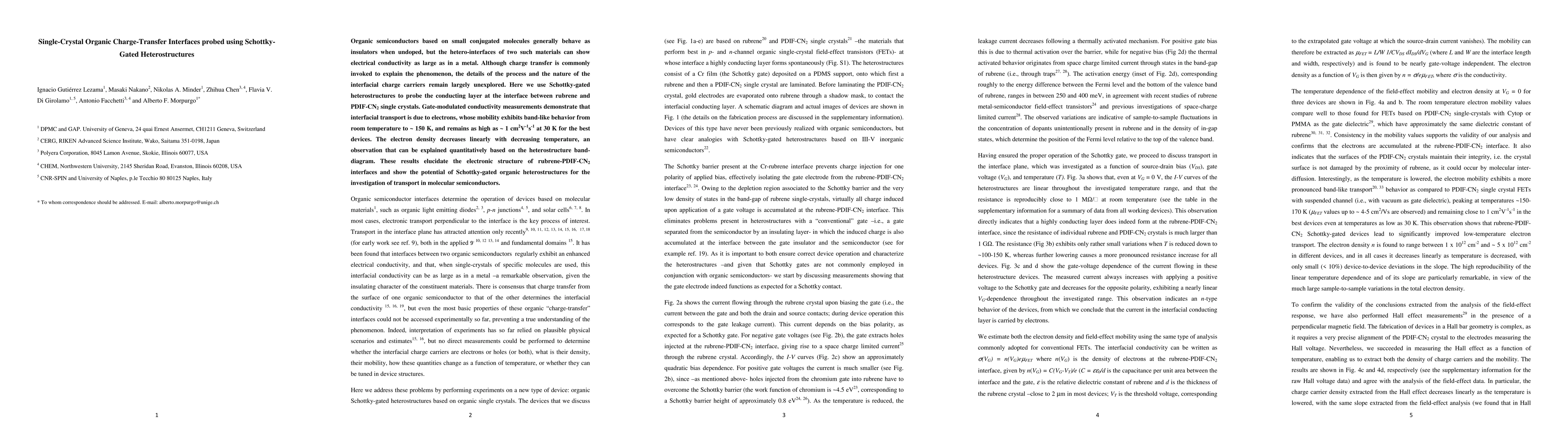 Organic semiconductors based on small conjugated molecules generally behave as insulators when undoped, but the hetero-interfaces of two such materials can show electrical conductivity as large as in a metal. Although charge transfer is commonly invoked to explain the phenomenon, the details of the process and the nature of the interfacial charge carriers remain largely unexplored. Here we use Schottky-gated heterostructures to probe the conducting layer at the interface between rubrene and PDIF-CN2 single crystals. Gate-modulated conductivity measurements demonstrate that interfacial transport is due to electrons, whose mobility exhibits band-like behavior from room temperature to ~ 150 K, and remains as high as ~ 1 cm2V-1s-1 at 30 K for the best devices. The electron density decreases linearly with decreasing temperature, an observation that can be explained quantitatively based on the heterostructure band diagram. These results elucidate the electronic structure of rubrene-PDIF-CN2 interfaces and show the potential of Schottky-gated organic heterostructures for the investigation of transport in molecular semiconductors.
