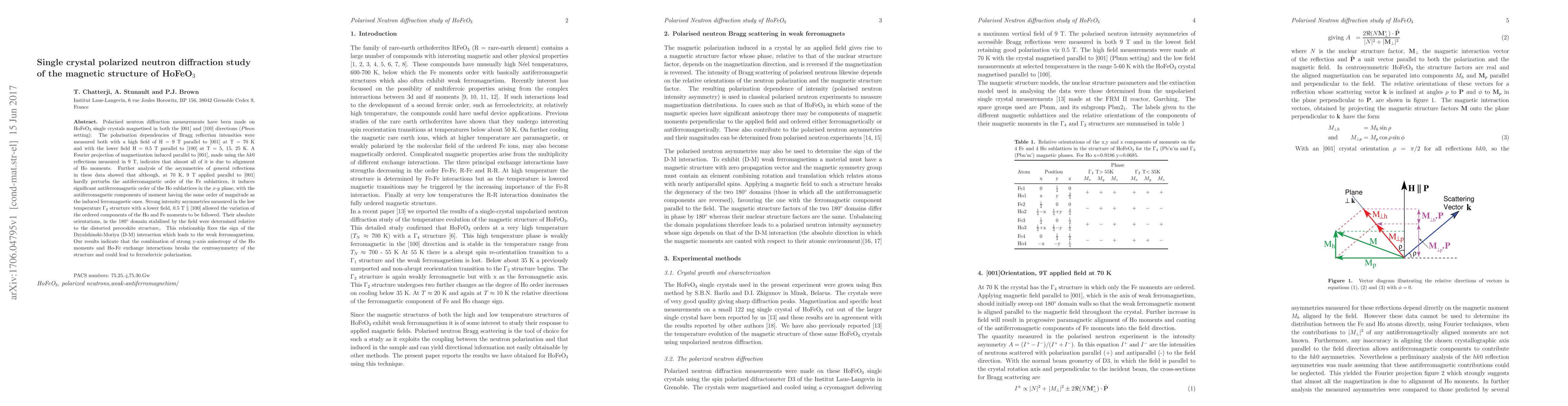 Polarised neutron diffraction measurements have been made on HoFeO$_3$ single crystals magnetised in both the [001] and [100] directions ($Pbnm$ setting). The polarisation dependencies of Bragg reflection intensities were measured both with a high field of H = 9 T parallel to [001] at T = 70 K and with the lower field H = 0.5 T parallel to [100] at T = 5, 15, 25~K. A Fourier projection of magnetization induced parallel to [001], made using the $hk0$ reflections measured in 9~T, indicates that almost all of it is due to alignment of Ho moments. Further analysis of the asymmetries of general reflections in these data showed that although, at 70~K, 9~T applied parallel to [001] hardly perturbs the antiferromagnetic order of the Fe sublattices, it induces significant antiferromagnetic order of the Ho sublattices in the $x\mhyphen y$ plane, with the antiferromagnetic components of moment having the same order of magnitude as the induced ferromagnetic ones. Strong intensity asymmetries measured in the low temperature $\Gamma_2$ structure with a lower field, 0.5 T $\parallel$ [100] allowed the variation of the ordered components of the Ho and Fe moments to be followed. Their absolute orientations, in the 180\degree\ domain stabilised by the field were determined relative to the distorted perovskite structure,. This relationship fixes the sign of the Dzyalshinski-Moriya (D-M) interaction which leads to the weak ferromagnetism. Our results indicate that the combination of strong y-axis anisotropy of the Ho moments and Ho-Fe exchange interactions breaks the centrosymmetry of the structure and could lead to ferroelectric polarization.