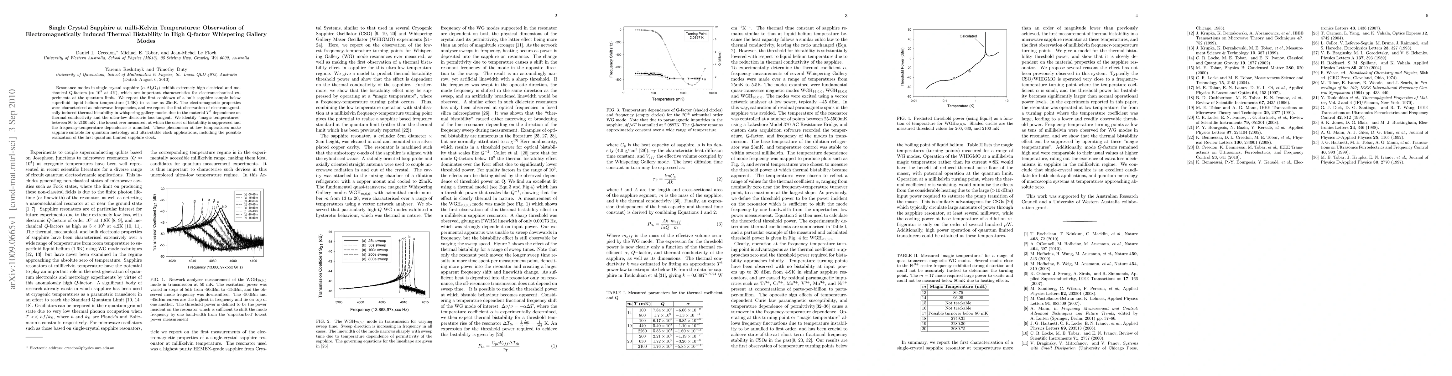 This paper reports the first observation of electromagnetically induced thermal bistability in high Q-factor whispering gallery modes in single crystal sapphire at milli-Kelvin temperatures. The study identifies "magic temperatures" where bistability is suppressed, highlighting sapphire's potential for quantum metrology and ultra-stable clock applications.