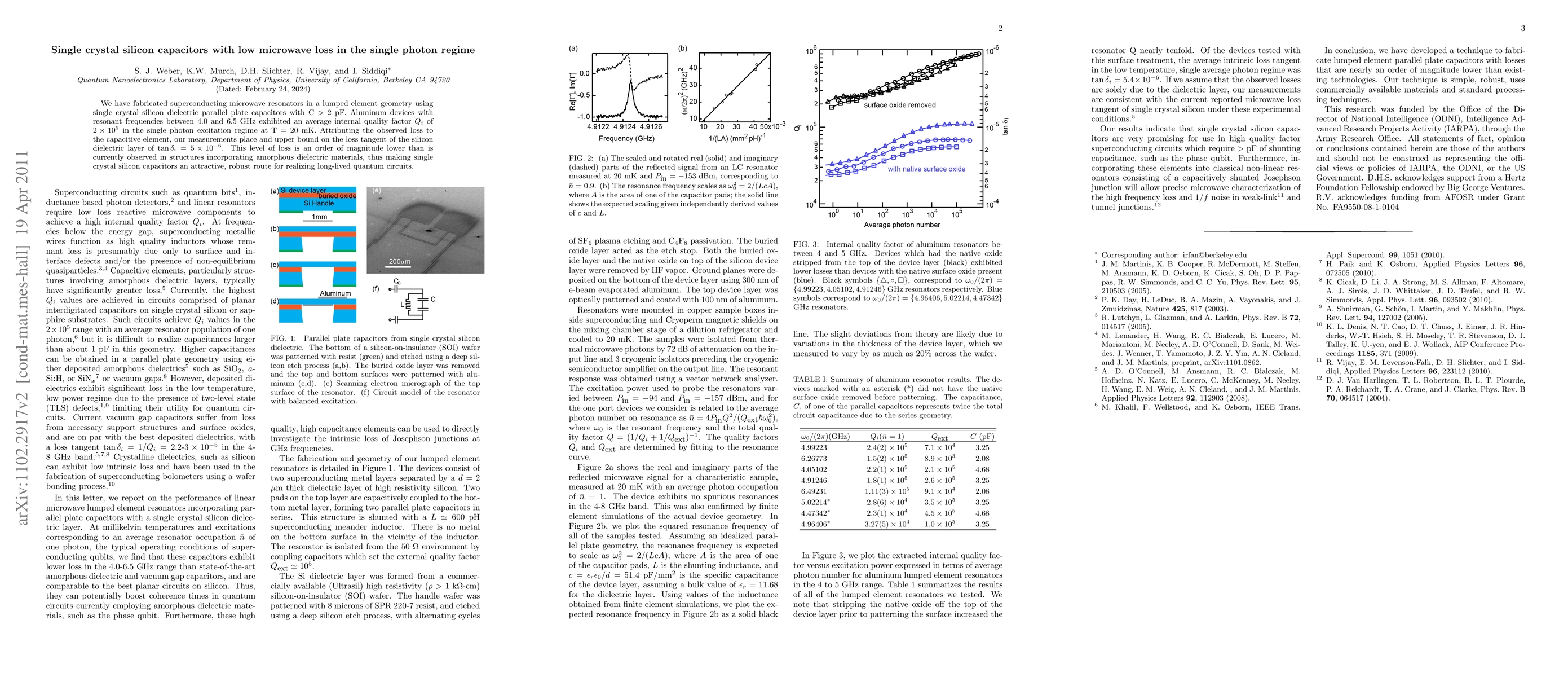 Researchers fabricated superconducting microwave resonators using single crystal silicon capacitors, achieving an average internal quality factor of 2 x 10^5 at 20 mK. The intrinsic loss tangent of silicon was determined to be 5 x 10^-6, significantly lower than amorphous dielectrics, highlighting the potential of single crystal silicon for long-lived quantum circuits.