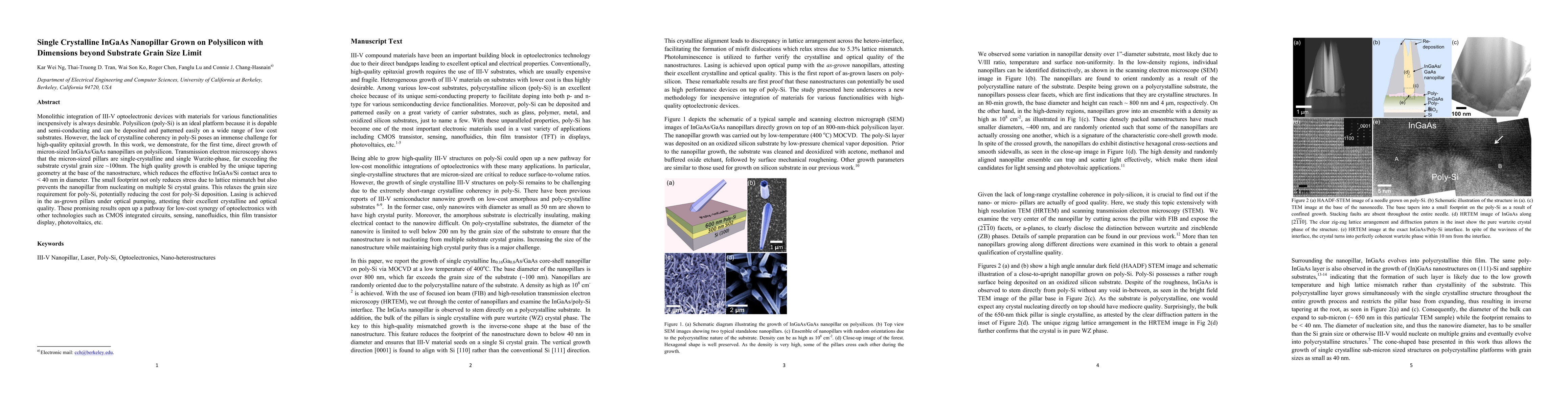 Monolithic integration of III-V optoelectronic devices with materials for various functionalities inexpensively is always desirable. Polysilicon (poly-Si) is an ideal platform because it is dopable and semi-conducting and can be deposited and patterned easily on a wide range of low cost substrates. However, the lack of crystalline coherency in poly-Si poses an immense challenge for high-quality epitaxial growth. In this work, we demonstrate, for the first time, direct growth of micron-sized InGaAs/GaAs nanopillars on polysilicon. Transmission electron microscopy shows that the micron-sized pillars are single-crystalline and single Wurzite-phase, far exceeding the substrate crystal grain size ~100nm. The high quality growth is enabled by the unique tapering geometry at the base of the nanostructure, which reduces the effective InGaAs/Si contact area to < 40 nm in diameter. The small footprint not only reduces stress due to lattice mismatch but also prevents the nanopillar from nucleating on multiple Si crystal grains. This relaxes the grain size requirement for poly-Si, potentially reducing the cost for poly-Si deposition. Lasing is achieved in the as-grown pillars under optical pumping, attesting their excellent crystalline and optical quality. These promising results open up a pathway for low-cost synergy of optoelectronics with other technologies such as CMOS integrated circuits, sensing, nanofluidics, thin film transistor display, photovoltaics, etc.