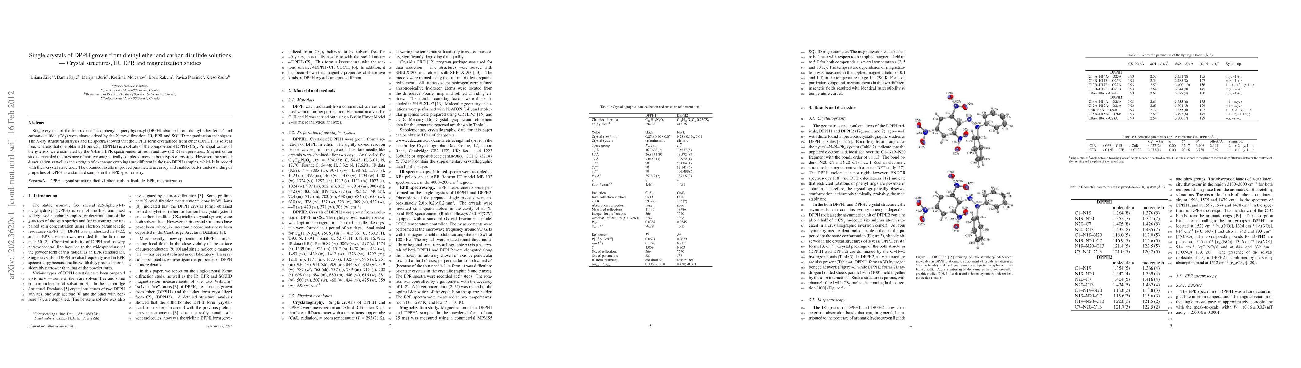 Single crystals of the free radical 2,2-diphenyl-1-picrylhydrazyl (DPPH) obtained from diethyl ether (ether) and carbon disulfide (CS2) were characterized by the X-ray diffraction, IR, EPR and SQUID magnetization techniques. The X-ray structural analysis and IR spectra showed that the DPPH form crystallized from ether (DPPH1) is solvent free, whereas that one obtained from CS2 (DPPH2) is a solvate of the composition 4DPPH.CS2. Principal values of the g-tensor were estimated by the X-band EPR spectroscopy at room and low (10 K) temperatures. Magnetization studies revealed the presence of antiferromagnetically coupled dimers in both types of crystals. However, the way of dimerization as well as the strength of exchange couplings are different in the two DPPH samples, which is in accord with their crystal structures. The obtained results improved parameters accuracy and enabled better understanding of properties of DPPH as a standard sample in the EPR spectrometry.