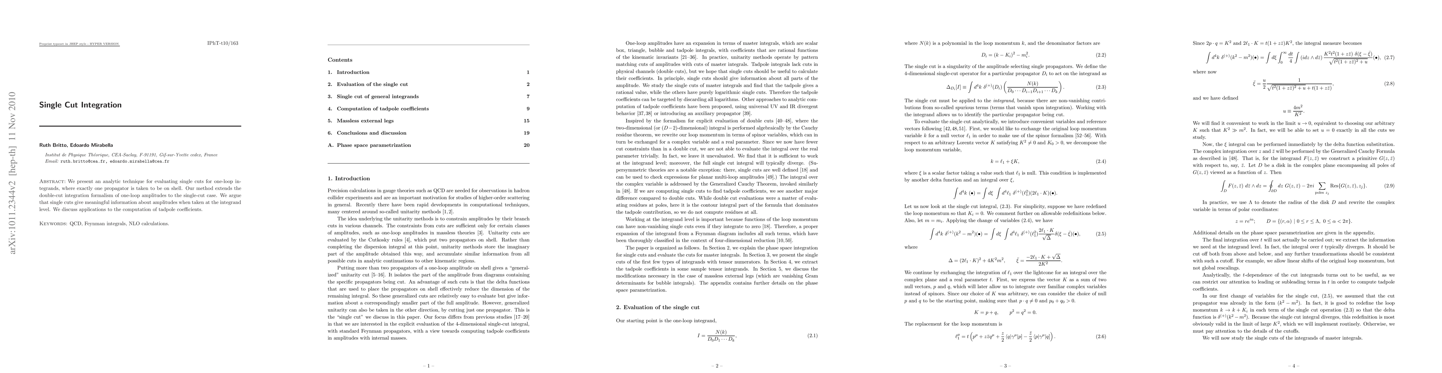 This paper introduces an analytic technique for evaluating single cuts in one-loop integrands, extending the double-cut integration formalism. The authors argue that single-cut evaluations provide valuable insights into amplitudes at the integrand level and apply the method to compute tadpole coefficients.