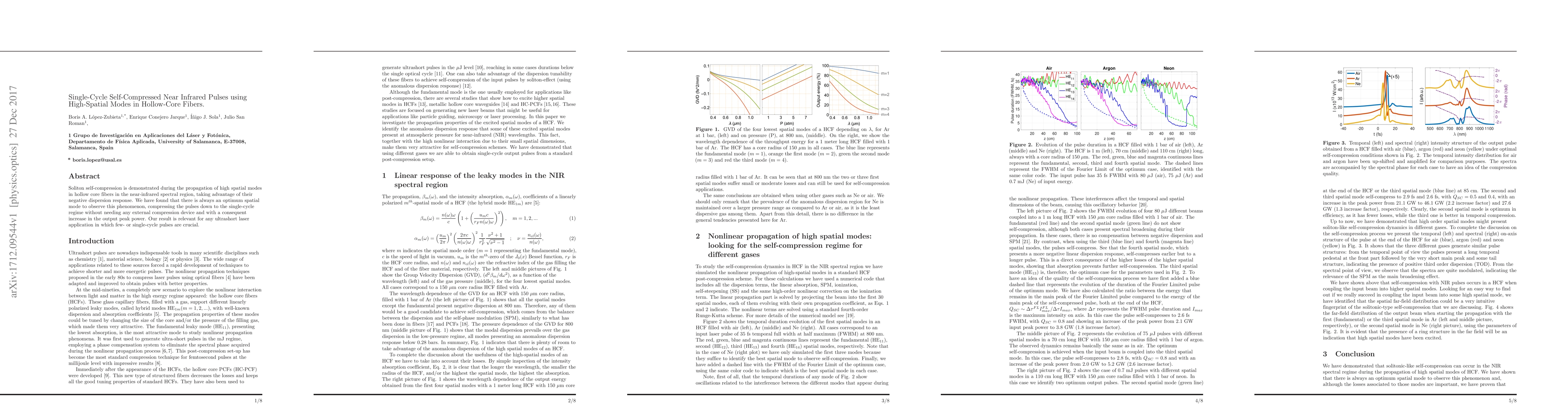 This paper demonstrates soliton self-compression of high-spatial modes in hollow-core fibers, achieving single-cycle near-infrared pulses without external compression, enhancing peak power and relevance for ultrashort laser applications.