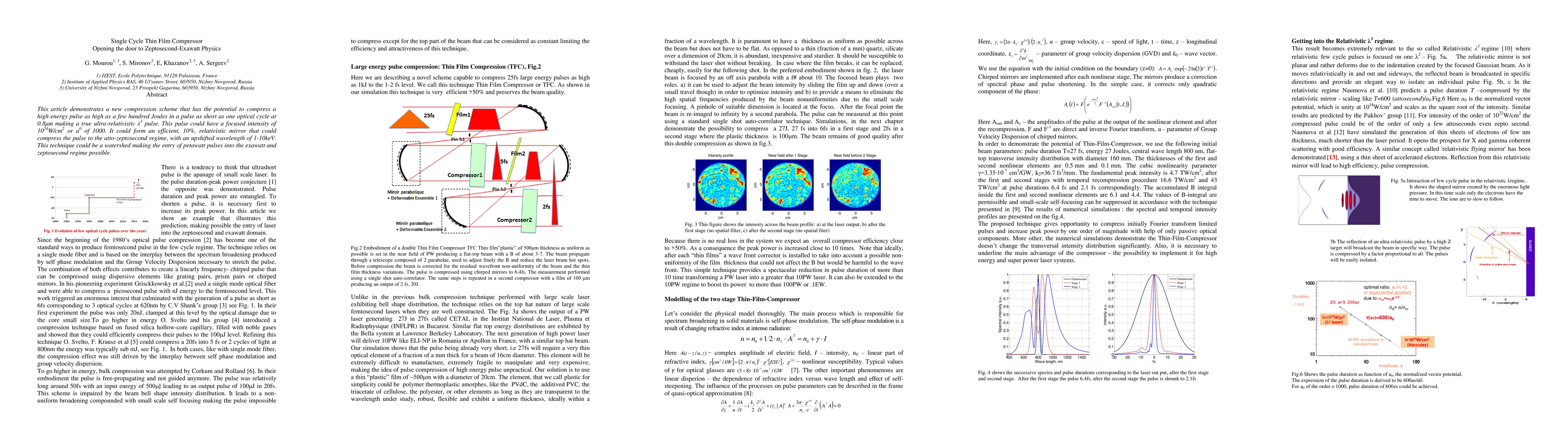 This paper presents a new compression method capable of generating ultra-relativistic pulses as short as one optical cycle, achieving intensities of 10^24W/cm2 and enabling the transition of petawatt pulses into the exawatt and zeptosecond regime. The technique promises to create efficient relativistic mirrors and upshifted wavelengths in the 1-10keV range.