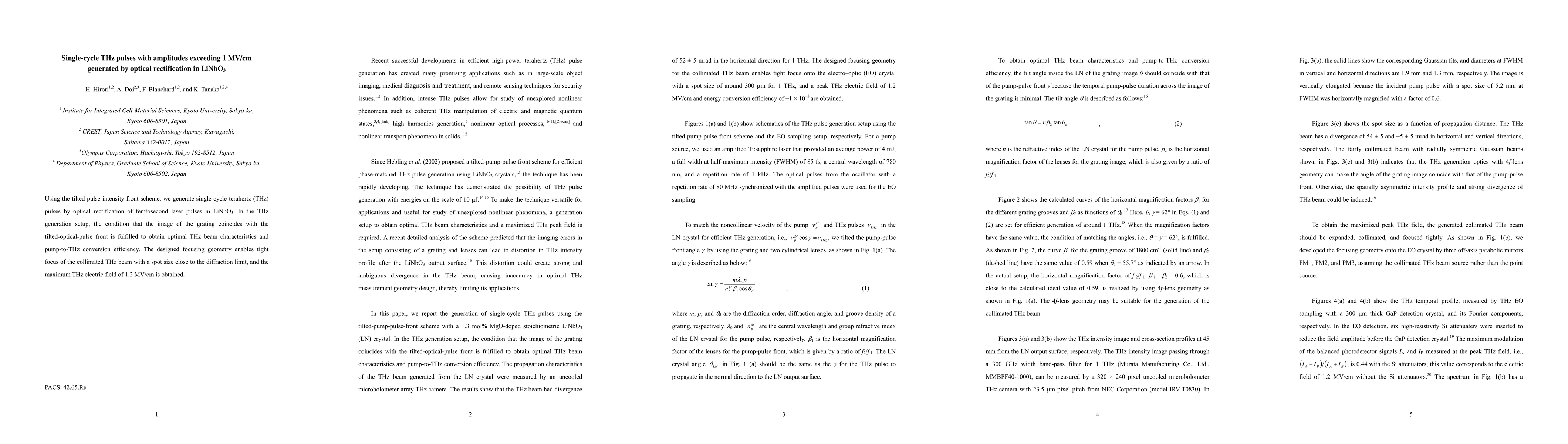 This paper reports the generation of single-cycle THz pulses with amplitudes over 1 MV/cm using optical rectification in LiNbO3, employing a tilted-pulse-intensity-front scheme for optimal THz beam characteristics and conversion efficiency. The setup achieves a THz spot size near the diffraction limit, resulting in a maximum THz electric field of 1.2 MV/cm.