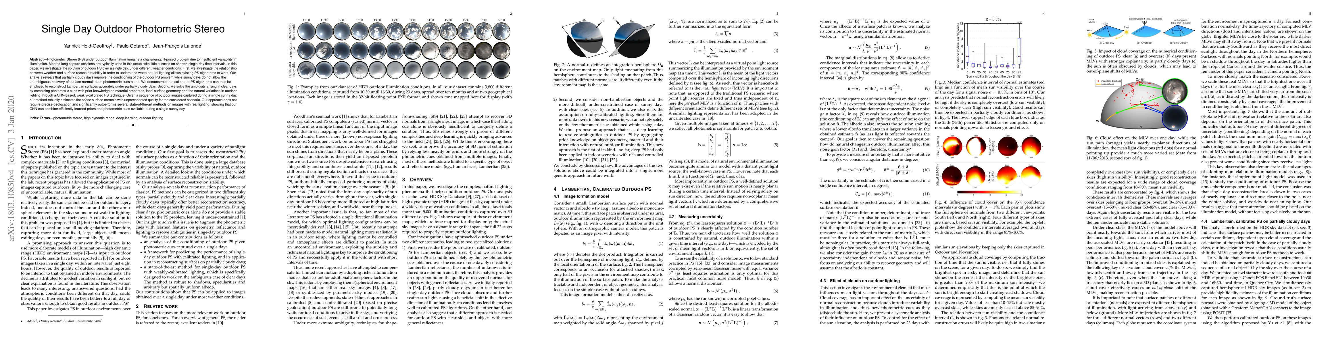 Photometric Stereo (PS) under outdoor illumination remains a challenging, ill-posed problem due to insufficient variability in illumination. Months-long capture sessions are typically used in this setup, with little success on shorter, single-day time intervals. In this paper, we investigate the solution of outdoor PS over a single day, under different weather conditions. First, we investigate the relationship between weather and surface reconstructability in order to understand when natural lighting allows existing PS algorithms to work. Our analysis reveals that partially cloudy days improve the conditioning of the outdoor PS problem while sunny days do not allow the unambiguous recovery of surface normals from photometric cues alone. We demonstrate that calibrated PS algorithms can thus be employed to reconstruct Lambertian surfaces accurately under partially cloudy days. Second, we solve the ambiguity arising in clear days by combining photometric cues with prior knowledge on material properties, local surface geometry and the natural variations in outdoor lighting through a CNN-based, weakly-calibrated PS technique. Given a sequence of outdoor images captured during a single sunny day, our method robustly estimates the scene surface normals with unprecedented quality for the considered scenario. Our approach does not require precise geolocation and significantly outperforms several state-of-the-art methods on images with real lighting, showing that our CNN can combine efficiently learned priors and photometric cues available during a single sunny day.