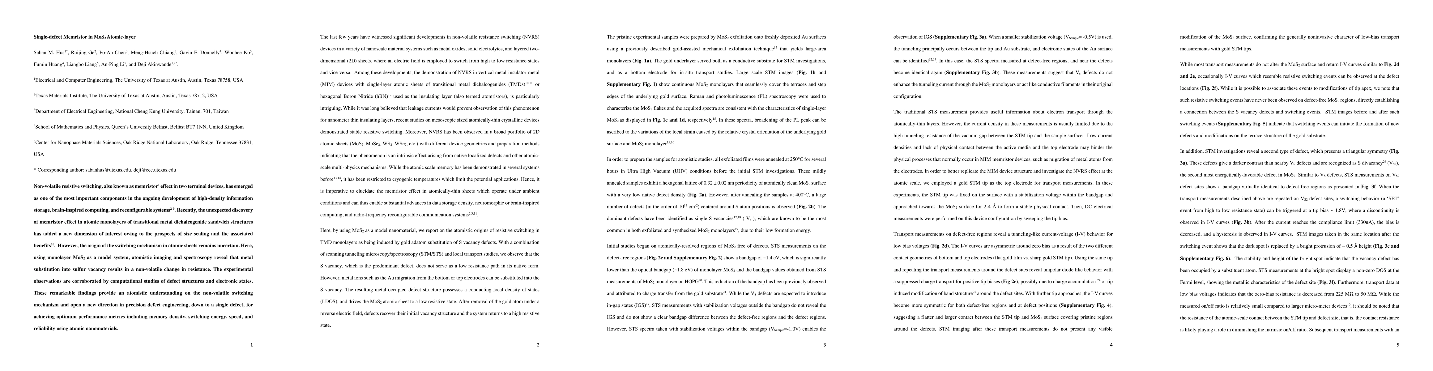 This paper investigates the memristor effect in monolayer MoS$_2$ atomic layers, revealing that metal substitution into sulfur vacancies induces non-volatile resistive switching. The findings, supported by both experimental imaging and computational studies, offer insights into the switching mechanism and pave the way for advanced defect engineering in atomic nanomaterials.