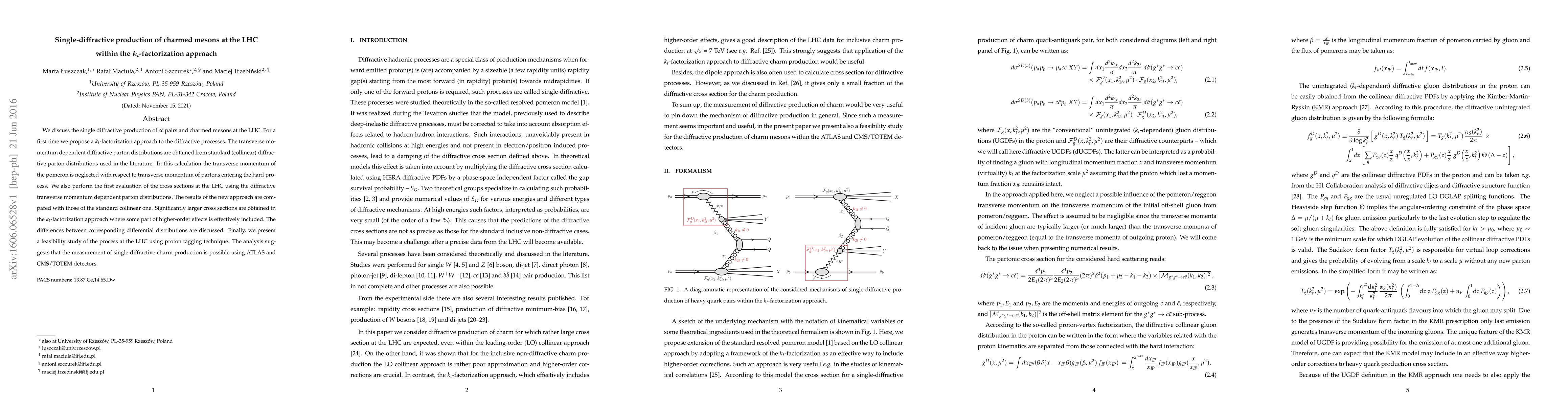 This paper proposes a $k_t$-factorization approach for single diffractive production of charmed mesons at the LHC, yielding significantly larger cross sections compared to the standard collinear approach. The study also assesses the feasibility of measuring this process using proton tagging techniques at the ATLAS and CMS/TOTEM detectors.