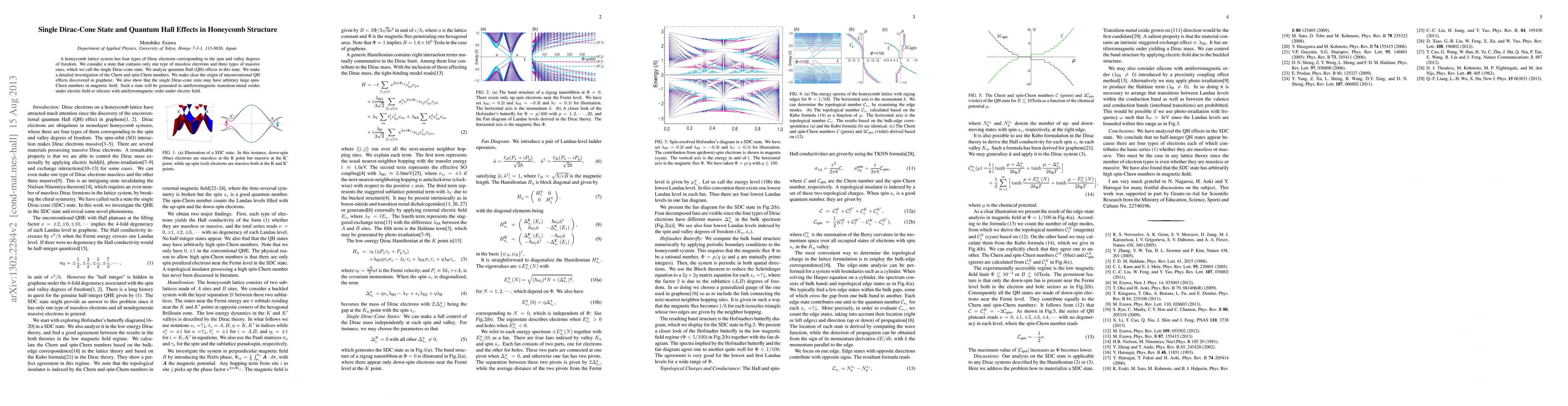 A honeycomb lattice system has four types of Dirac electrons corresponding to the spin and valley degrees of freedom. We consider a state that contains only one type of massless electrons and three types of massive ones, which we call the single Dirac-cone state. We analyze quantum Hall (QH) effects in this state. We make a detailed investigation of the Chern and spin-Chern numbers. We make clear the origin of unconventional QH effects discovered in graphene. We also show that the single Dirac-cone state may have arbitrary large spin-Chern numbers in magnetic field. Such a state will be generated in antiferromagnetic transition-metal oxides under electric field or silicene with antiferromagnetic order under electric field.