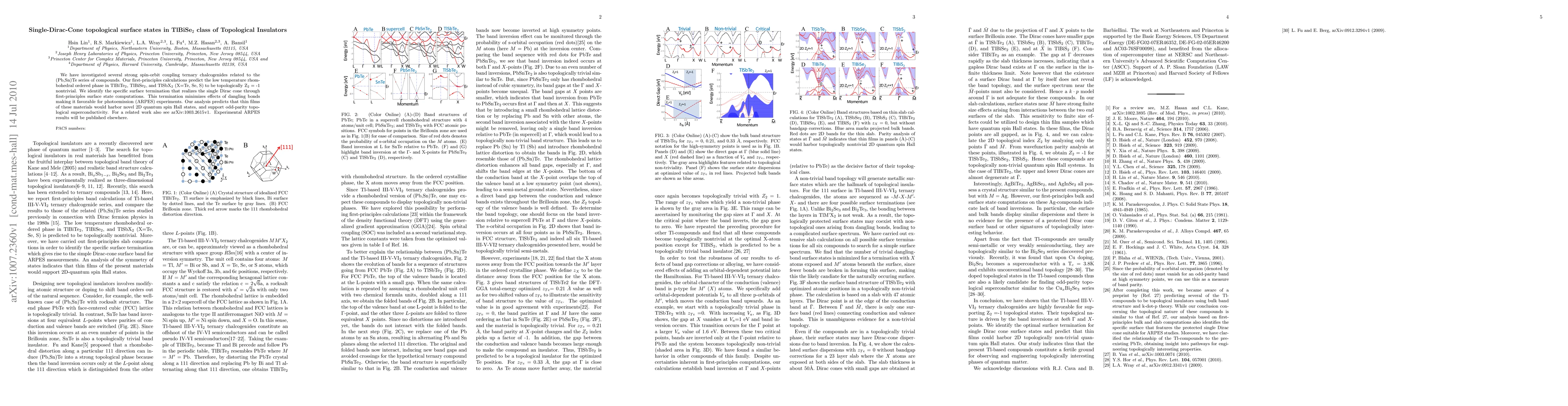 We have investigated several strong spin-orbit coupling ternary chalcogenides related to the (Pb,Sn)Te series of compounds. Our first-principles calculations predict the low temperature rhombohedral ordered phase in TlBiTe2, TlBiSe2, and TlSbX2 (X=Te, Se, S) to be topologically Kane-Mele Z2 = -1 nontrivial. We identify the specific surface termination that realizes the single Dirac cone through first-principles surface state computations. This termination minimizes effects of dangling bonds making it favorable for photoemission (ARPES) experiments. Our analysis predicts that thin films of these materials would harbor novel 2D quantum spin Hall states, and support odd-parity topological superconductivity. For a related work also see arXiv:1003.2615v1. Experimental ARPES results will be published elsewhere.