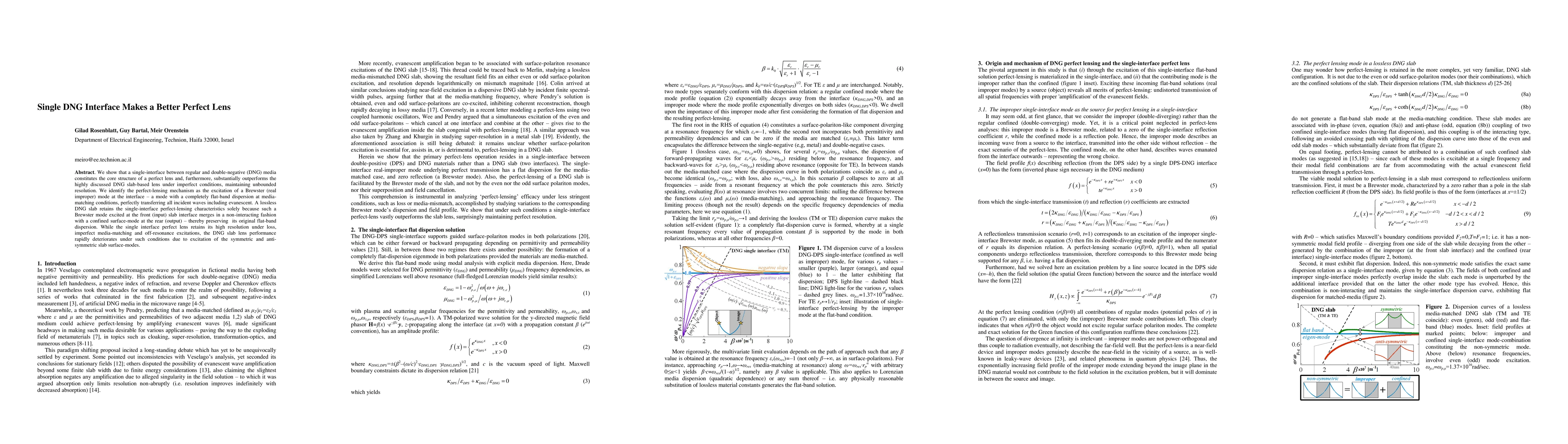 The research demonstrates that a single interface between regular and double-negative media forms the basis of a perfect lens, significantly outperforming traditional DNG slab lenses, especially under adverse conditions, due to the excitation of a Brewster mode that maintains high resolution. The single-interface lens maintains its performance despite imperfections, unlike the DNG slab lens.