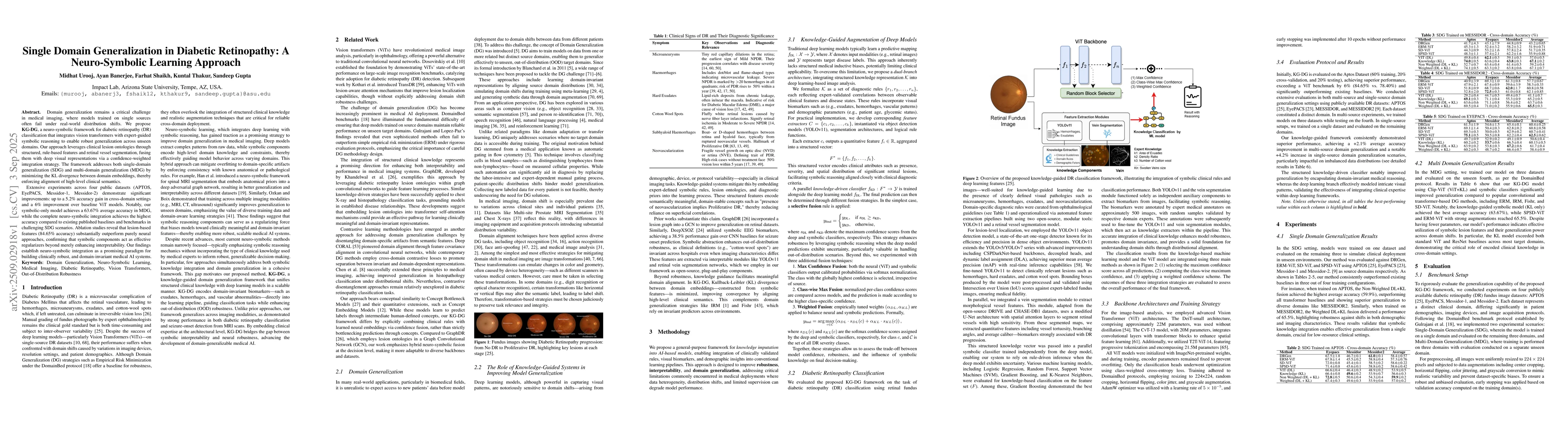 Domain generalization remains a critical challenge in medical imaging, where models trained on single sources often fail under real-world distribution shifts. We propose KG-DG, a neuro-symbolic framework for diabetic retinopathy (DR) classification that integrates vision transformers with expert-guided symbolic reasoning to enable robust generalization across unseen domains. Our approach leverages clinical lesion ontologies through structured, rule-based features and retinal vessel segmentation, fusing them with deep visual representations via a confidence-weighted integration strategy. The framework addresses both single-domain generalization (SDG) and multi-domain generalization (MDG) by minimizing the KL divergence between domain embeddings, thereby enforcing alignment of high-level clinical semantics. Extensive experiments across four public datasets (APTOS, EyePACS, Messidor-1, Messidor-2) demonstrate significant improvements: up to a 5.2% accuracy gain in cross-domain settings and a 6% improvement over baseline ViT models. Notably, our symbolic-only model achieves a 63.67% average accuracy in MDG, while the complete neuro-symbolic integration achieves the highest accuracy compared to existing published baselines and benchmarks in challenging SDG scenarios. Ablation studies reveal that lesion-based features (84.65% accuracy) substantially outperform purely neural approaches, confirming that symbolic components act as effective regularizers beyond merely enhancing interpretability. Our findings establish neuro-symbolic integration as a promising paradigm for building clinically robust, and domain-invariant medical AI systems.