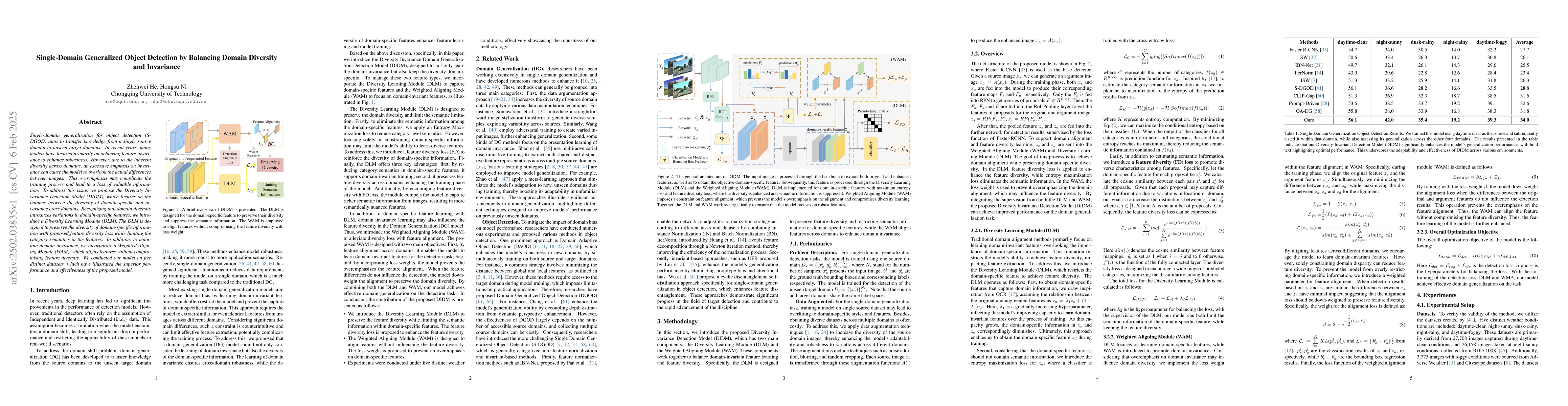 The paper proposes the Diversity Invariance Detection Model (DIDM) to balance domain diversity and invariance for single-domain generalized object detection. The Diversity Learning Module (DLM) preserves domain-specific features while the Weighted Aligning Module (WAM) maintains domain invariance, demonstrating superior performance across five datasets.