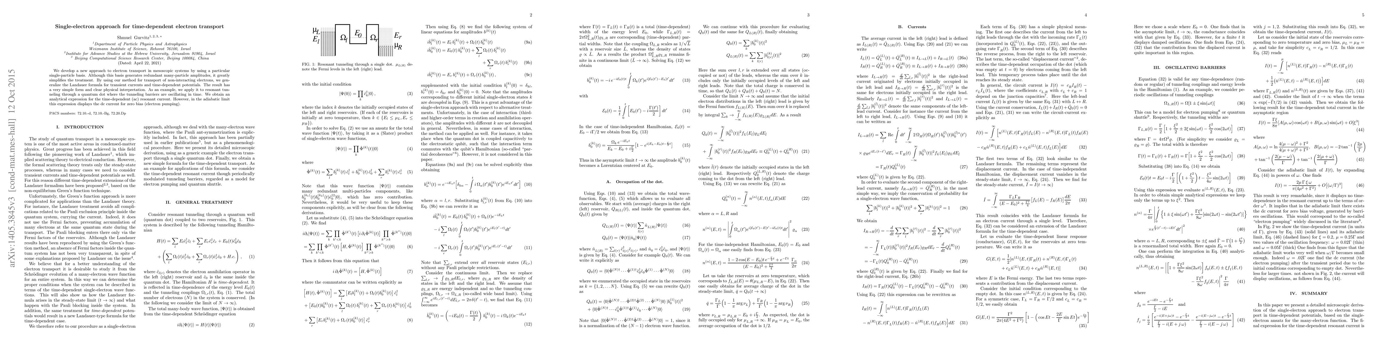 This paper introduces a novel single-electron approach to study time-dependent electron transport in mesoscopic systems, simplifying the treatment despite generating redundant many-particle amplitudes. The method generalizes the Landauer formula for transient currents under time-dependent potentials, providing a simple and physically interpretable result, exemplified by an analytical expression for ac resonant current through oscillating tunneling barriers in a quantum dot.