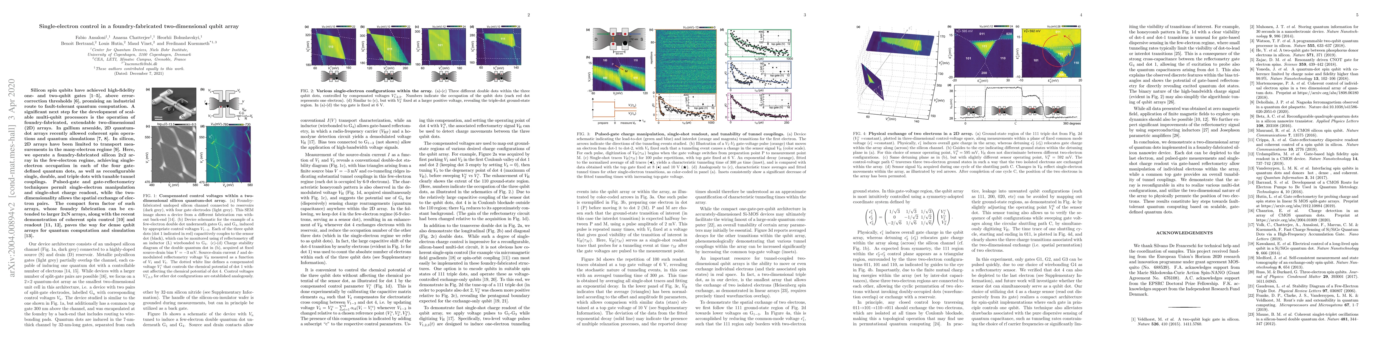 This research demonstrates single-electron control in a foundry-fabricated silicon 2x2 qubit array, achieving precise manipulation and readout, which is crucial for scalable quantum computing. The scalable compact design, combined with recent advances in spin control, supports the development of dense qubit arrays for quantum computation.