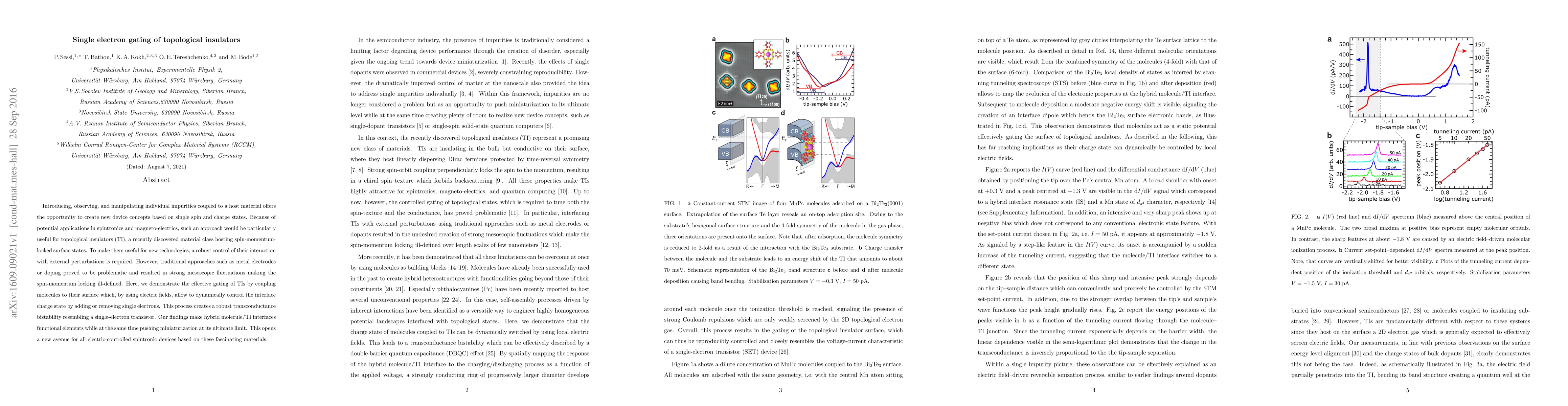 Introducing, observing, and manipulating individual impurities coupled to a host material offers the opportunity to create new device concepts based on single spin and charge states. Because of potential applications in spintronics and magneto-electrics, such an approach would be particularly useful for topological insulators (TI), a recently discovered material class hosting spin-momentum- locked surface states. To make them useful for new technologies, a robust control of their interaction with external perturbations is required. However, traditional approaches such as metal electrodes or doping proved to be problematic and resulted in strong mesoscopic fluctuations making the spin-momentum locking ill-defined. Here, we demonstrate the effective gating of TIs by coupling molecules to their surface which, by using electric fields, allow to dynamically control the interface charge state by adding or removing single electrons. This process creates a robust transconductance bistability resembling a single-electron transistor. Our findings make hybrid molecule/TI interfaces functional elements while at the same time pushing miniaturization at its ultimate limit. This opens a new avenue for all electric-controlled spintronic devices based on these fascinating materials.