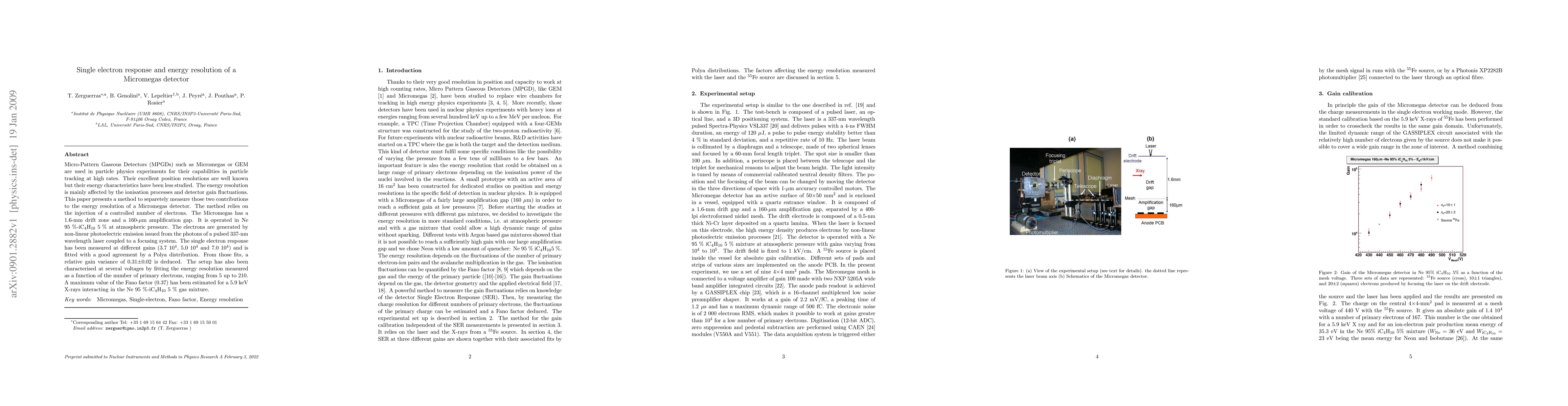 Micro-Pattern Gaseous Detectors (MPGDs) such as Micromegas or GEM are used in particle physics experiments for their capabilities in particle tracking at high rates. Their excellent position resolutions are well known but their energy characteristics have been less studied. The energy resolution is mainly affected by the ionisation processes and detector gain fluctuations. This paper presents a method to separetely measure those two contributions to the energy resolution of a Micromegas detector. The method relies on the injection of a controlled number of electrons. The Micromegas has a 1.6-mm drift zone and a 160-$\mu$m amplification gap. It is operated in Ne 95%-iC$\mathrm{_4}$H$\mathrm{_{10}}$ 5% at atmospheric pressure. The electrons are generated by non-linear photoelectric emission issued from the photons of a pulsed 337-nm wavelength laser coupled to a focusing system. The single electron response has been measured at different gains (3.7 10$\mathrm{^4}$, 5.0 10$\mathrm{^4}$ and 7.0 10$\mathrm{^4}$) and is fitted with a good agreement by a Polya distribution. From those fits, a relative gain variance of 0.31$\pm$0.02 is deduced. The setup has also been characterised at several voltages by fitting the energy resolution measured as a function of the number of primary electrons, ranging from 5 up to 210. A maximum value of the Fano factor (0.37) has been estimated for a 5.9 keV X-rays interacting in the Ne 95%-iC$\mathrm{_4}$H$\mathrm{_{10}}$ 5% gas mixture.