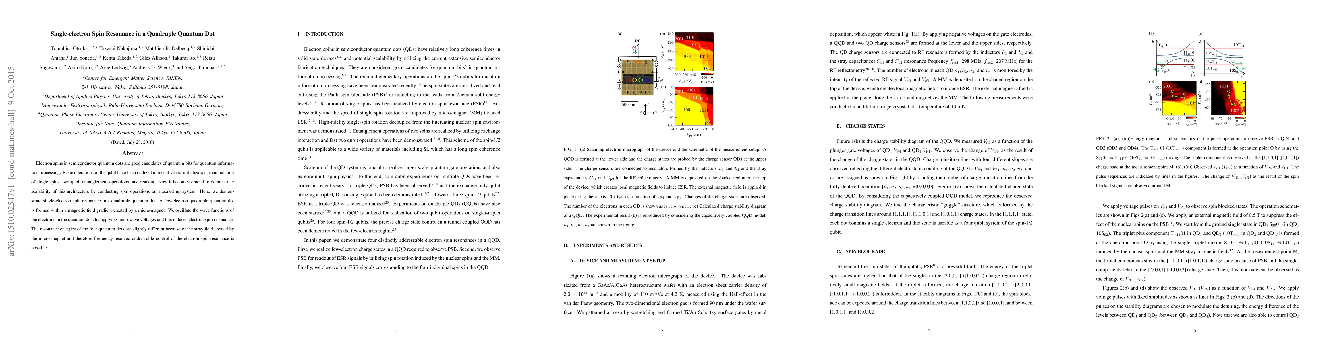 This study demonstrates single-electron spin resonance in a quadruple quantum dot, utilizing microwave voltages to oscillate electron wave functions and achieve frequency-resolved addressable control of electron spin resonance. The slight differences in resonance energies due to a magnetic field gradient allow scalable quantum information processing operations.