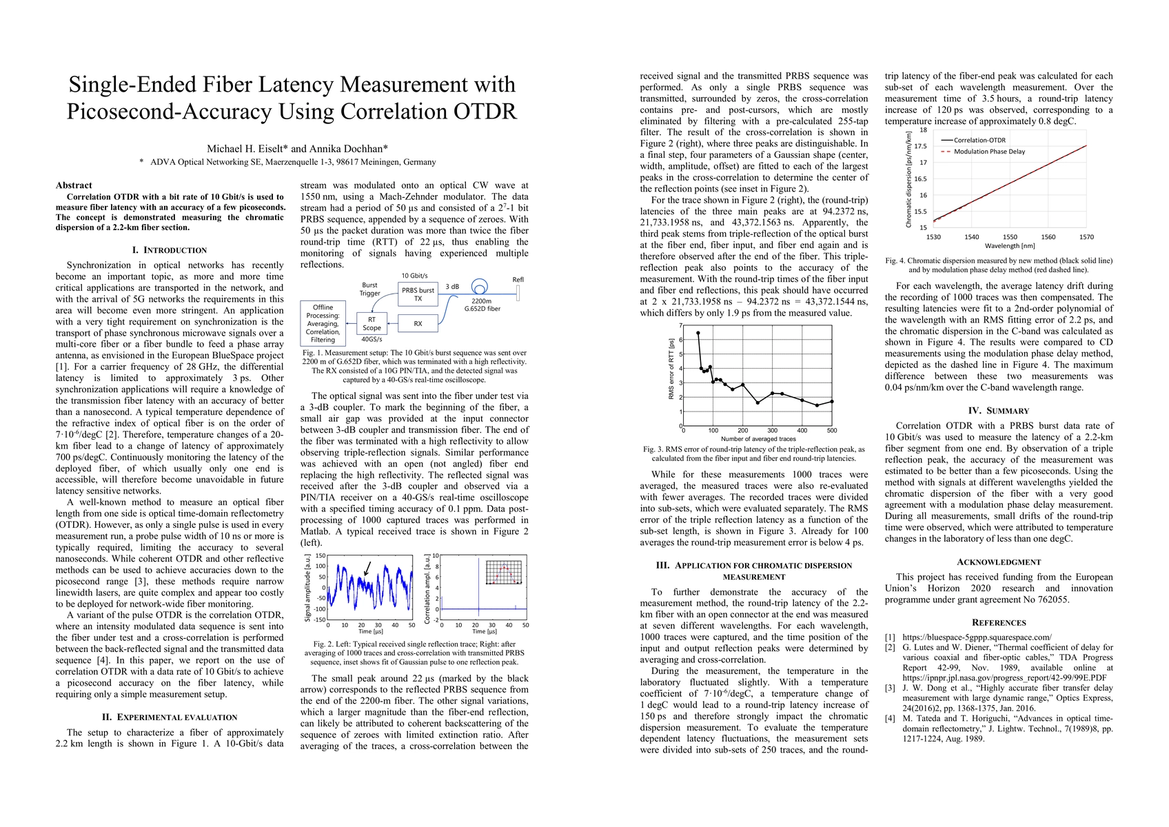 This paper presents a method for measuring fiber latency with picosecond accuracy using a correlation Optical Time-Domain Reflectometer (OTDR) operating at 10 Gbit/s. The technique demonstrates the measurement of chromatic dispersion in a 2.2-km fiber section, showcasing its precision.
