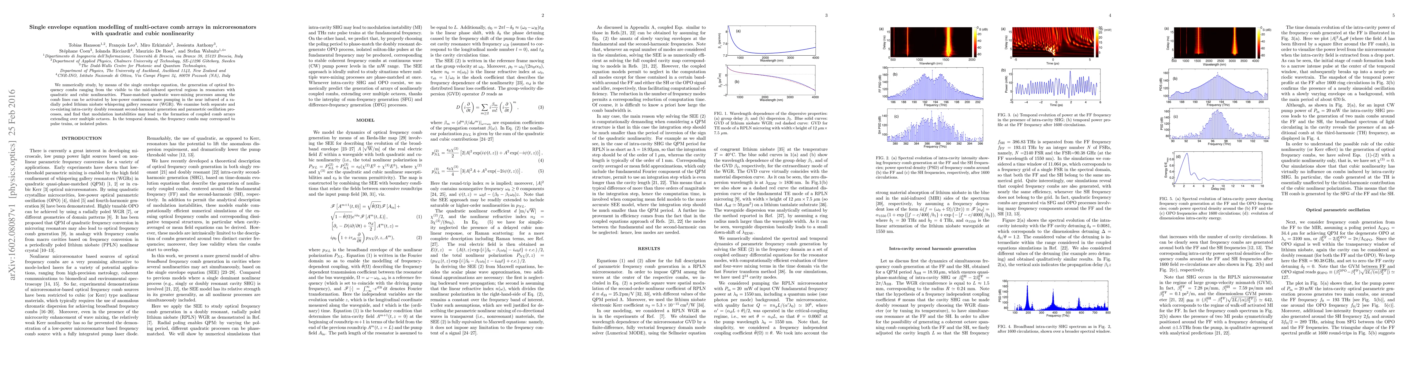 This paper numerically investigates the generation of multi-octave optical frequency combs in microresonators using the single envelope equation, focusing on resonators with quadratic and cubic nonlinearities. The study explores the formation of coupled comb arrays via modulation instabilities in radially poled lithium niobate whispering gallery resonators, highlighting the potential for both pulse trains and isolated pulses.