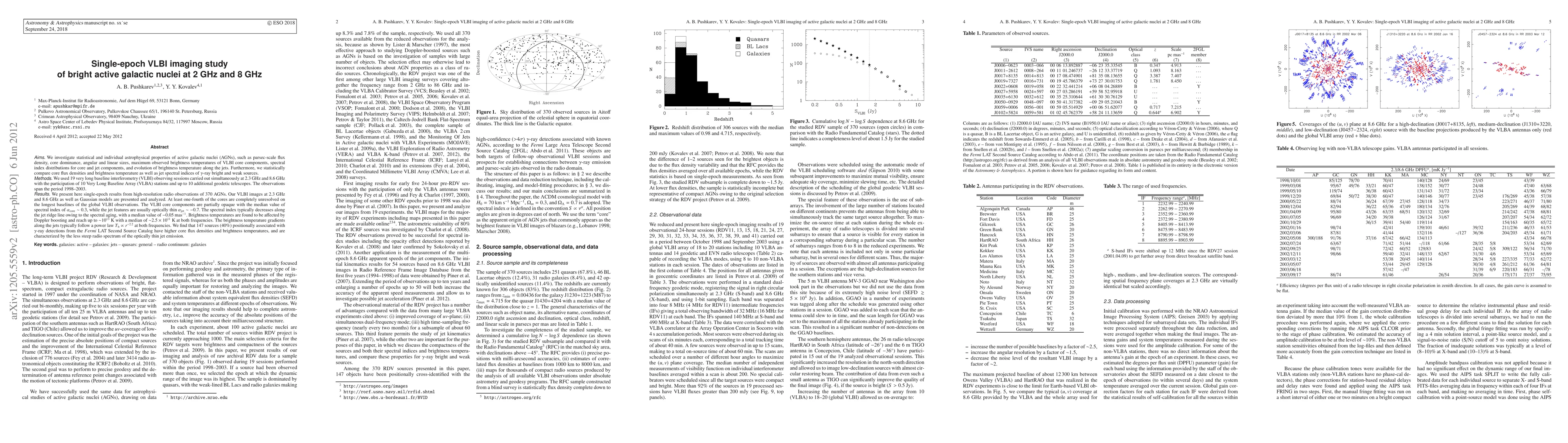 A study of 370 active galactic nuclei imaged using Very Long Baseline Interferometry (VLBI) at two frequencies reveals that most cores are completely unresolved, with partially opaque core components and optically thin jet features. Brightness temperatures vary along the jets, often following a power law relationship.