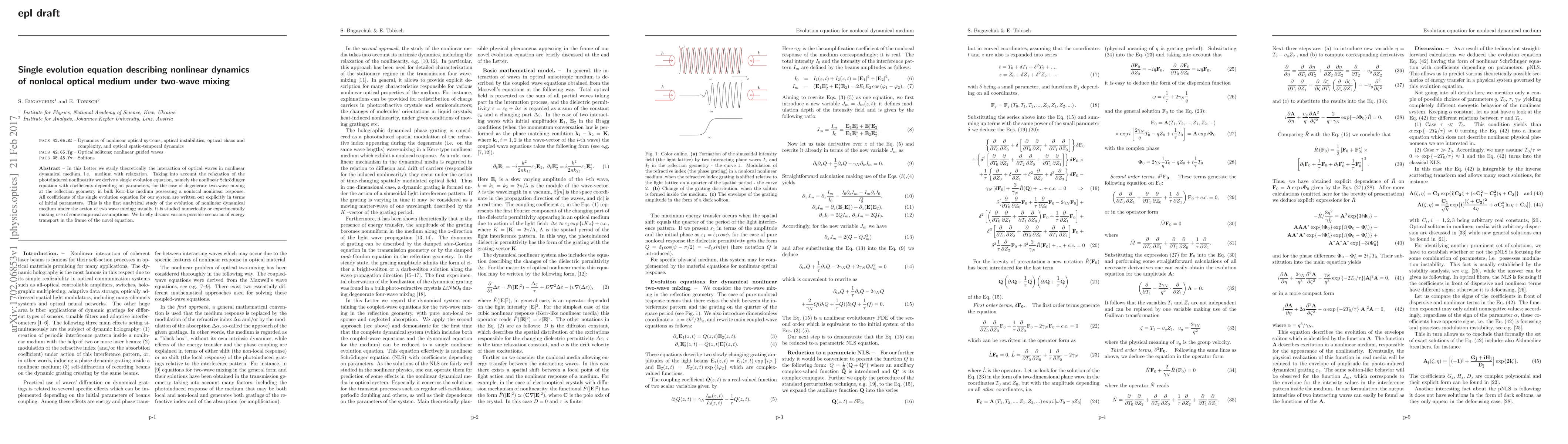 Researchers derive a single evolution equation to describe nonlocal optical medium dynamics under two-wave mixing, providing new insights into energy transport in bulk Kerr-like media.