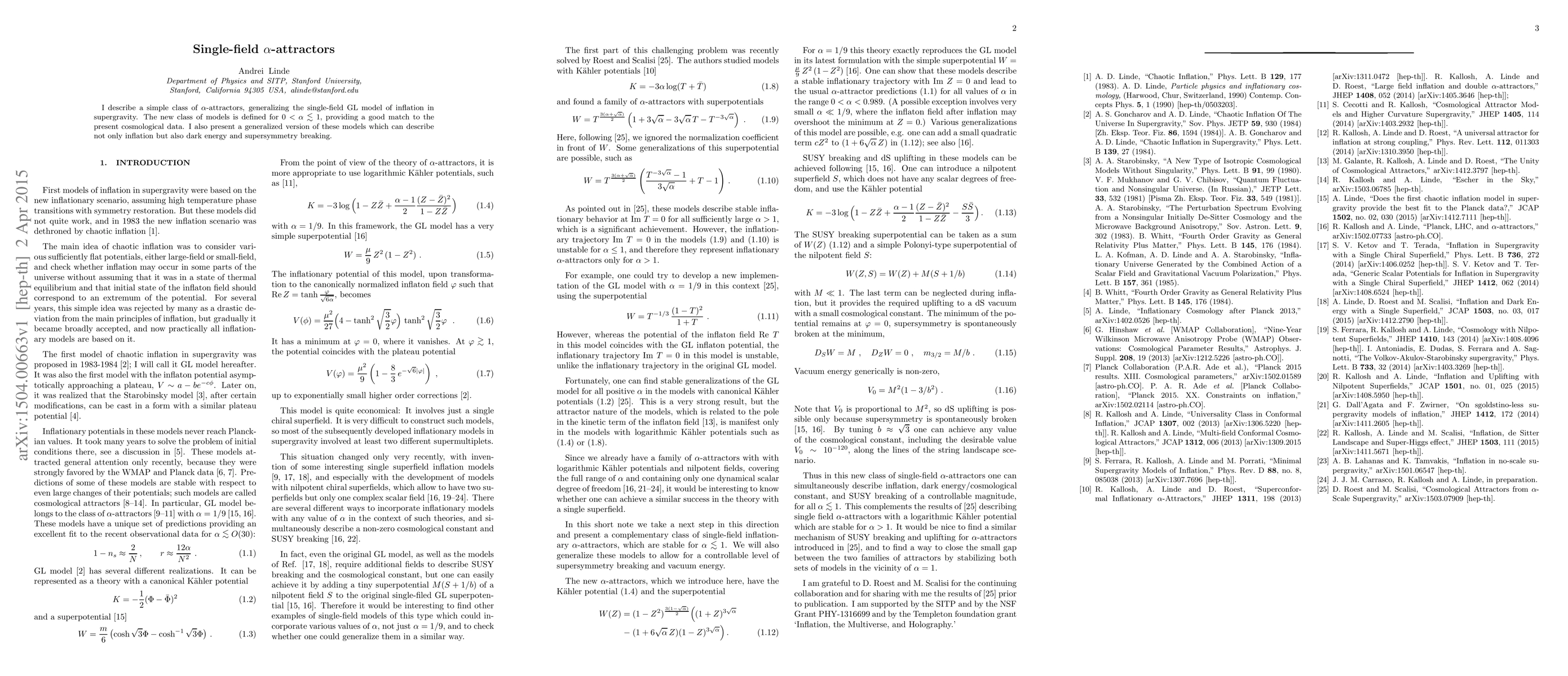 I describe a simple class of $\alpha$-attractors, generalizing the single-field GL model of inflation in supergravity. The new class of models is defined for $0<\alpha \lesssim 1$, providing a good match to the present cosmological data. I also present a generalized version of these models which can describe not only inflation but also dark energy and supersymmetry breaking.