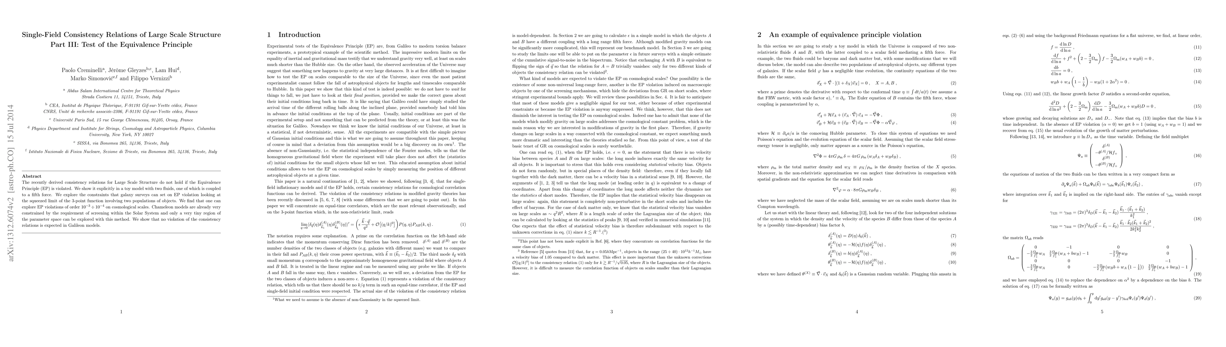 This paper tests the Equivalence Principle (EP) in large scale structure using consistency relations, finding that galaxy surveys can constrain EP violations to order 10^{-3} - 10^{-4}. It concludes that while chameleon models are tightly constrained by Solar System screening, Galileon models do not violate these consistency relations.