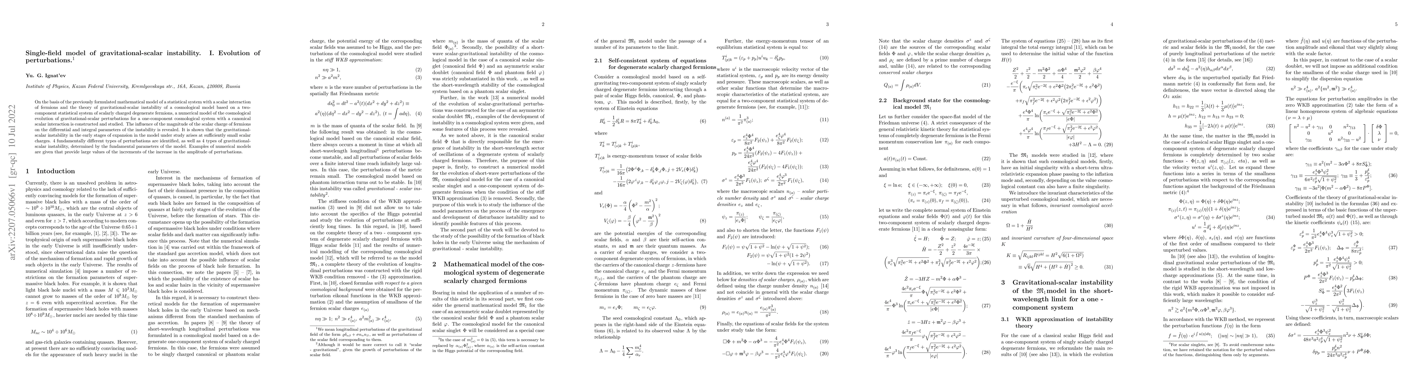 This paper constructs a numerical model to study the evolution of gravitational-scalar perturbations in a cosmological system with scalarly charged fermions, revealing four types of perturbations and instabilities influenced by the scalar charge magnitude. It highlights the emergence of gravitational-scalar instability at small scalar charges during early expansion stages.
