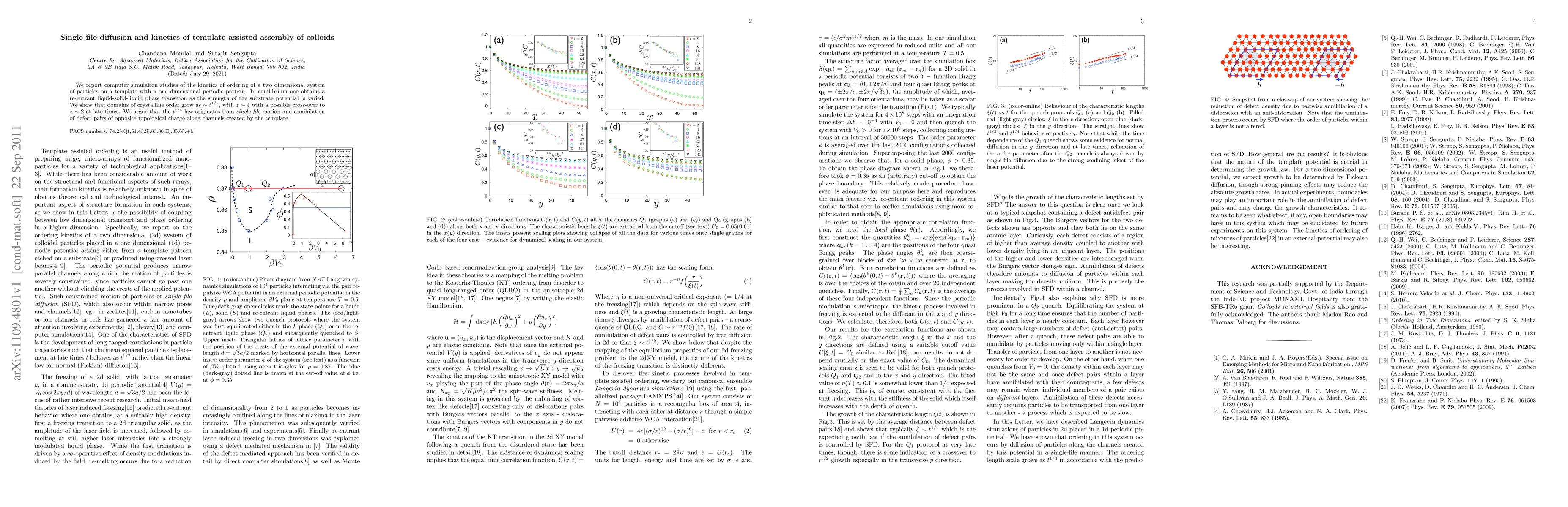 We report computer simulation studies of the kinetics of ordering of a two dimensional system of particles on a template with a one dimensional periodic pattern. In equilibrium one obtains a re-entrant liquid-solid-liquid phase transition as the strength of the substrate potential is varied. We show that domains of crystalline order grow as $\sim t^{1/z}$, with $z \sim 4$ with a possible cross-over to $z \sim 2$ at late times. We argue that the $t^{1/4}$ law originates from {\em single-file} motion and annihilation of defect pairs of opposite topological charge along channels created by the template.