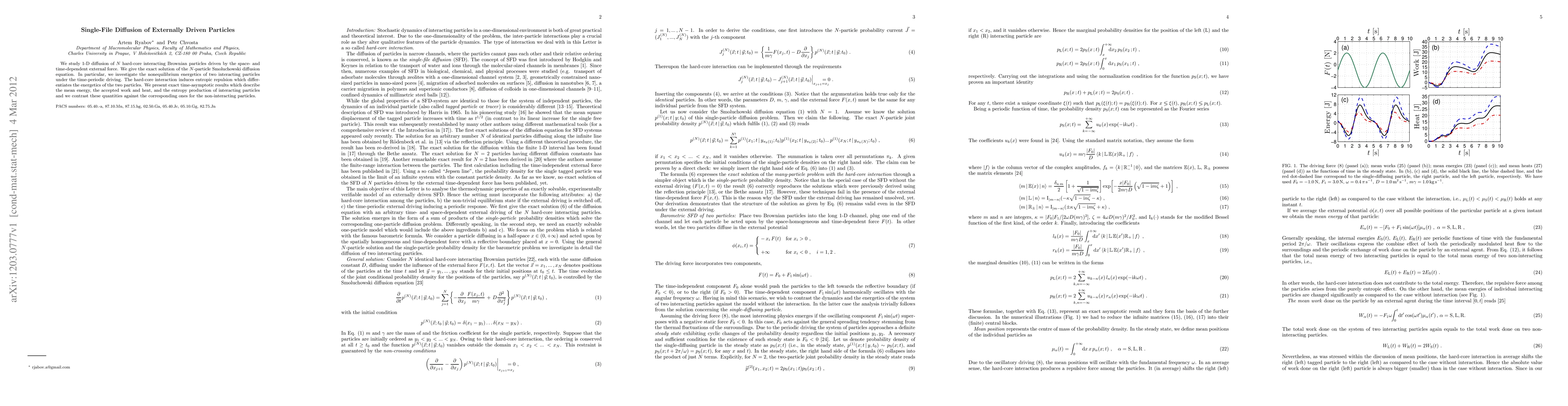 We study 1-D diffusion of $N$ hard-core interacting Brownian particles driven by the space- and time-dependent external force. We give the exact solution of the $N$-particle Smoluchowski diffusion equation. In particular, we investigate the nonequilibrium energetics of two interacting particles under the time-periodic driving. The hard-core interaction induces entropic repulsion which differentiates the energetics of the two particles. We present exact time-asymptotic results which describe the mean energy, the accepted work and heat, and the entropy production of interacting particles and we contrast these quantities against the corresponding ones for the non-interacting particles.