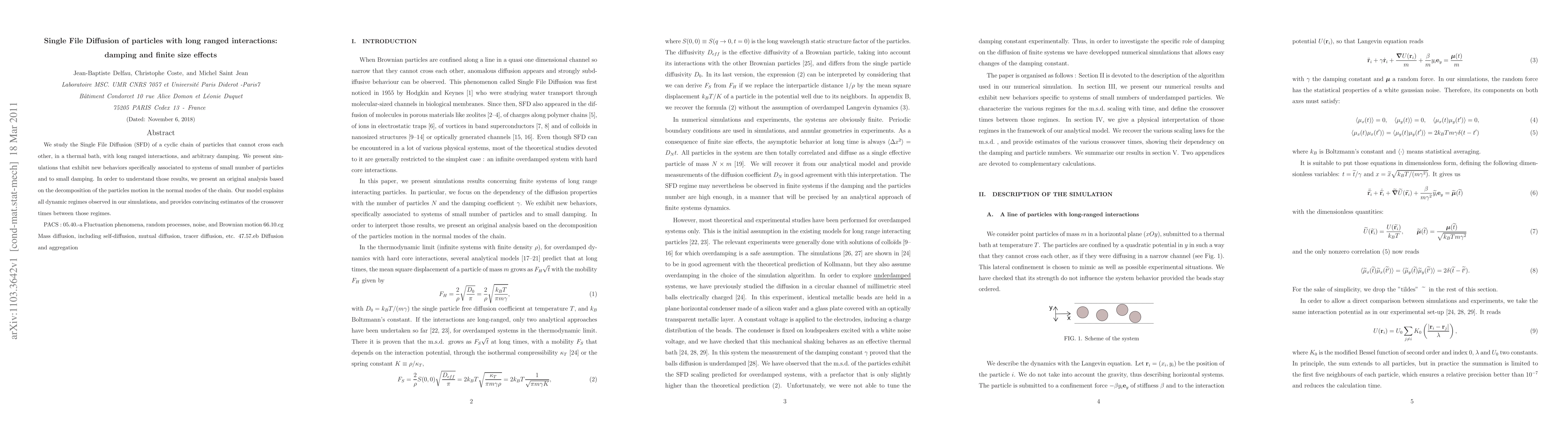 We study the Single File Diffusion (SFD) of a cyclic chain of particles that cannot cross each other, in a thermal bath, with long ranged interactions, and arbitrary damping. We present simulations that exhibit new behaviors specifically associated to systems of small number of particles and to small damping. In order to understand those results, we present an original analysis based on the decomposition of the particles motion in the normal modes of the chain. Our model explains all dynamic regimes observed in our simulations, and provides convincing estimates of the crossover times between those regimes.