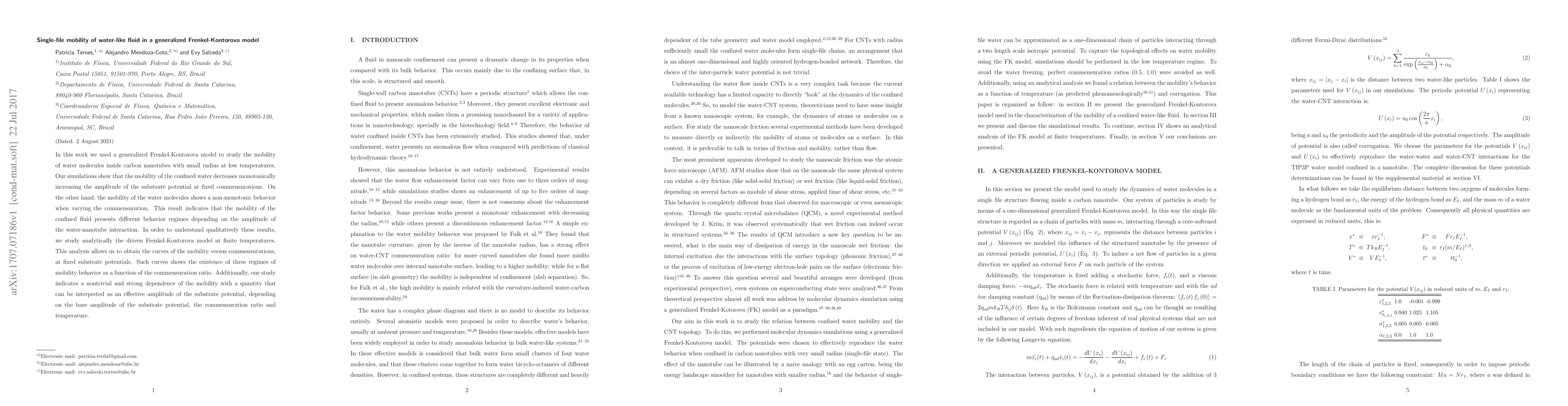 This paper investigates the mobility of water molecules in carbon nanotubes using a generalized Frenkel-Kontorova model, revealing a monotonic decrease in mobility with increasing substrate potential amplitude and a non-monotonic behavior with varying commensuration. Analytical studies reveal three mobility regimes based on the commensuration ratio, highlighting a complex dependence on the effective substrate potential amplitude.