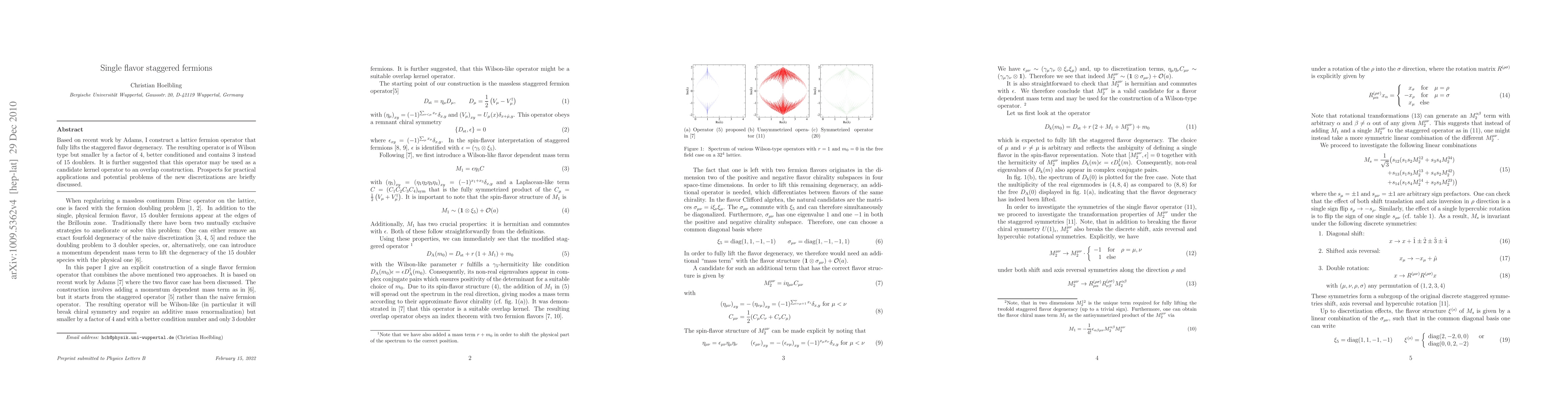 Based on recent work by Adams, I construct a lattice fermion operator that fully lifts the staggered flavor degeneracy. The resulting operator is of Wilson type but smaller by a factor of 4, better conditioned and contains 3 instead of 15 doublers. It is further suggested that this operator may be used as a candidate kernel operator to an overlap construction. Prospects for practical applications and potential problems of the new discretizations are briefly discussed.