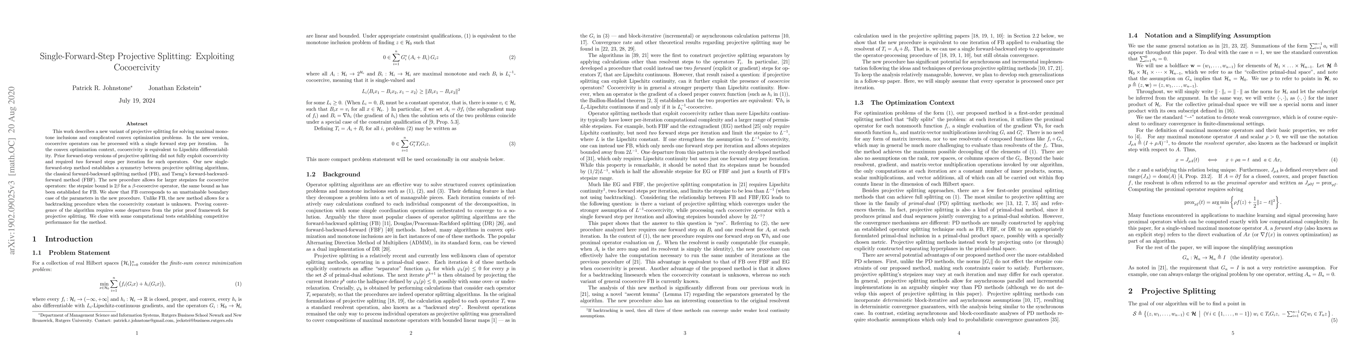 This paper introduces a new single-forward-step projective splitting method for solving maximal monotone inclusions and convex optimization problems, allowing for efficient processing of cocoercive operators. The method achieves symmetry with classical splitting algorithms and enables larger step sizes, while also permitting a backtracking procedure when the cocoercivity constant is unknown.