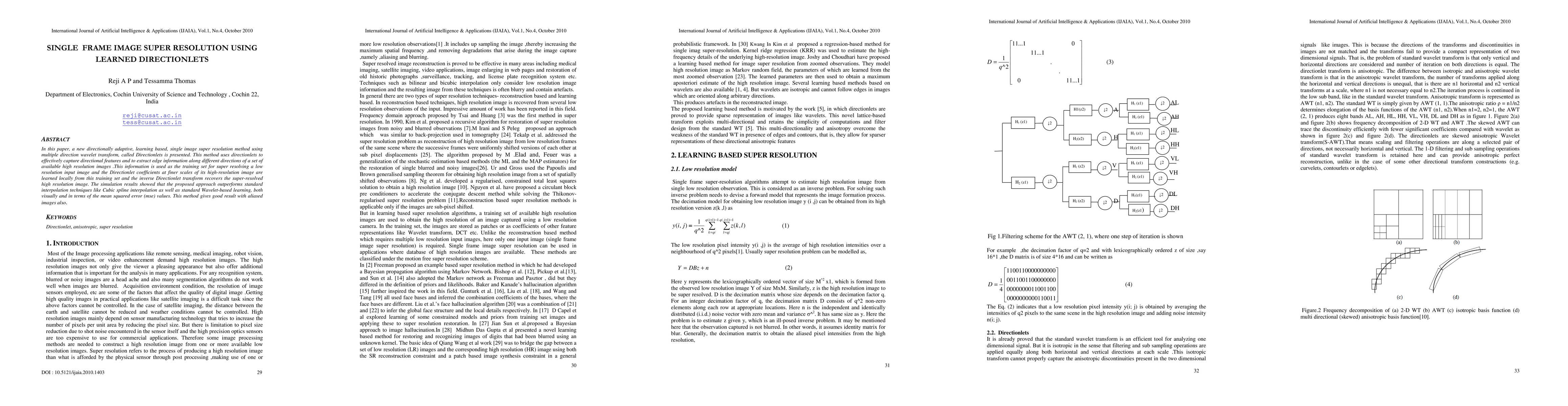 In this paper, a new directionally adaptive, learning based, single image super resolution method using multiple direction wavelet transform, called Directionlets is presented. This method uses directionlets to effectively capture directional features and to extract edge information along different directions of a set of available high resolution images .This information is used as the training set for super resolving a low resolution input image and the Directionlet coefficients at finer scales of its high-resolution image are learned locally from this training set and the inverse Directionlet transform recovers the super-resolved high resolution image. The simulation results showed that the proposed approach outperforms standard interpolation techniques like Cubic spline interpolation as well as standard Wavelet-based learning, both visually and in terms of the mean squared error (mse) values. This method gives good result with aliased images also.