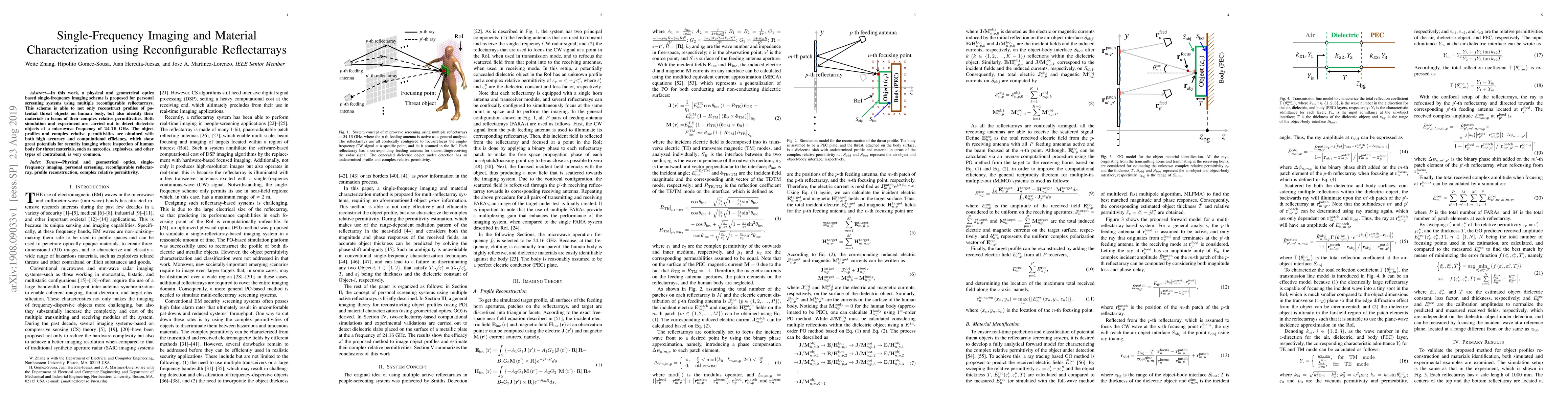In this work, a physical and geometrical optics based single-frequency imaging scheme is proposed for personal screening systems using multiple reconfigurable reflectarrays. This scheme is able to not only reconstruct profiles of potential threat objects on human body, but also identify their materials in terms of their complex relative permittivities. Both simulation and experiment are carried out to detect dielectric objects at a microwave frequency of 24.16 GHz. The object profiles and complex relative permittivities are obtained with both high accuracy and computational efficiency, which show great potentials for security imaging where inspection of human body for threat materials, such as narcotics, explosives, and other types of contraband, is very common.