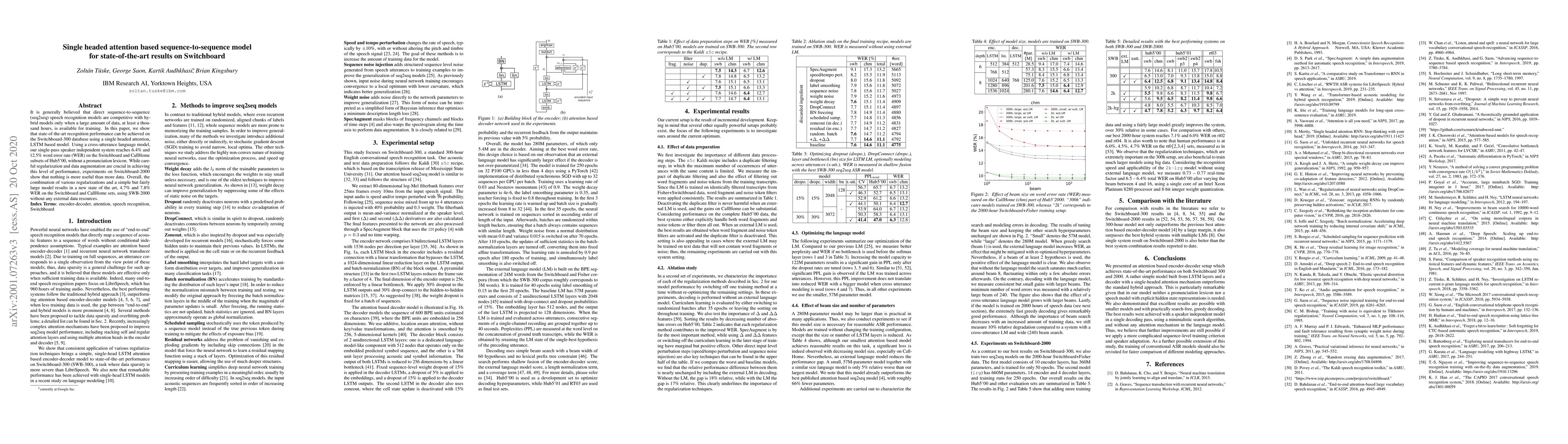 It is generally believed that direct sequence-to-sequence (seq2seq) speech recognition models are competitive with hybrid models only when a large amount of data, at least a thousand hours, is available for training. In this paper, we show that state-of-the-art recognition performance can be achieved on the Switchboard-300 database using a single headed attention, LSTM based model. Using a cross-utterance language model, our single-pass speaker independent system reaches 6.4% and 12.5% word error rate (WER) on the Switchboard and CallHome subsets of Hub5'00, without a pronunciation lexicon. While careful regularization and data augmentation are crucial in achieving this level of performance, experiments on Switchboard-2000 show that nothing is more useful than more data. Overall, the combination of various regularizations and a simple but fairly large model results in a new state of the art, 4.7% and 7.8% WER on the Switchboard and CallHome sets, using SWB-2000 without any external data resources.