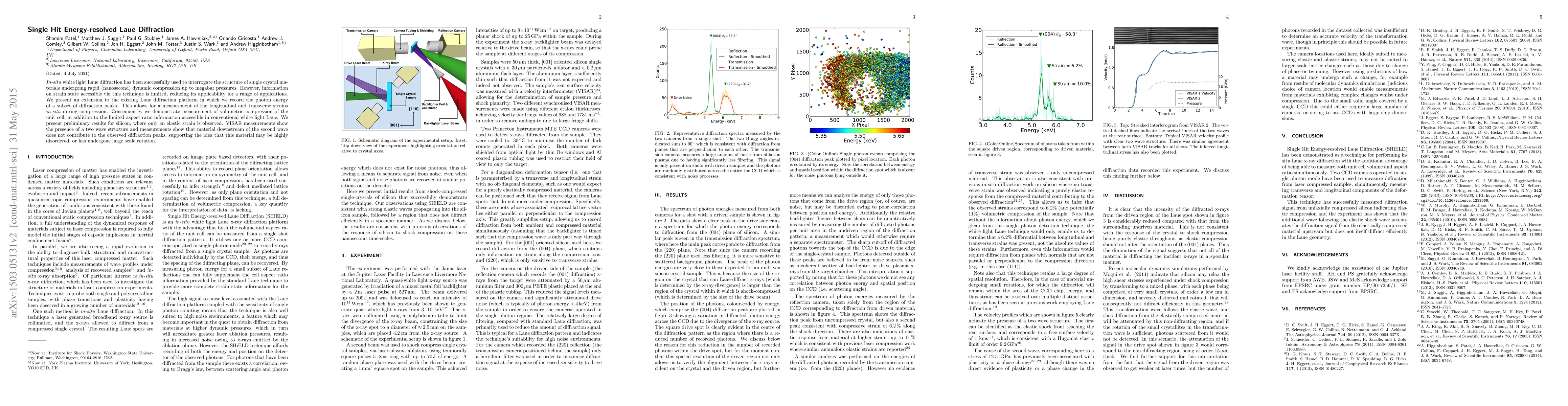 In-situ white light Laue diffraction has been successfully used to interrogate the structure of single crystal materials undergoing rapid (nanosecond) dynamic compression up to megabar pressures. However, information on strain state accessible via this technique is limited, reducing its applicability for a range of applications. We present an extension to the existing Laue diffraction platform in which we record the photon energy of a subset of diffraction peaks. This allows for a measurement of the longitudinal and transverse strains in-situ during compression. Consequently, we demonstrate measurement of volumetric compression of the unit cell, in addition to the limited aspect ratio information accessible in conventional white light Laue. We present preliminary results for silicon, where only an elastic strain is observed. VISAR measurements show the presence of a two wave structure and measurements show that material downstream of the second wave does not contribute to the observed diffraction peaks, supporting the idea that this material may be highly disordered, or has undergone large scale rotation.