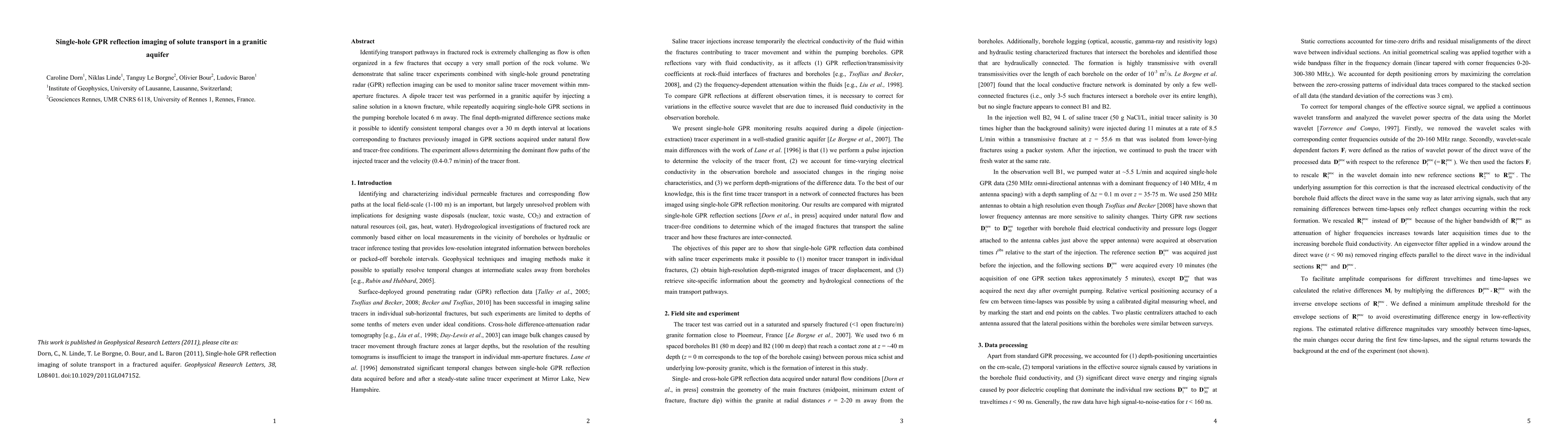 This study uses single-hole GPR reflection imaging to monitor saline tracer movement in mm-aperture fractures within a granitic aquifer. The experiment identifies dominant flow paths and tracer front velocity (0.4-0.7 m/min) by comparing GPR sections before and after saline injection.