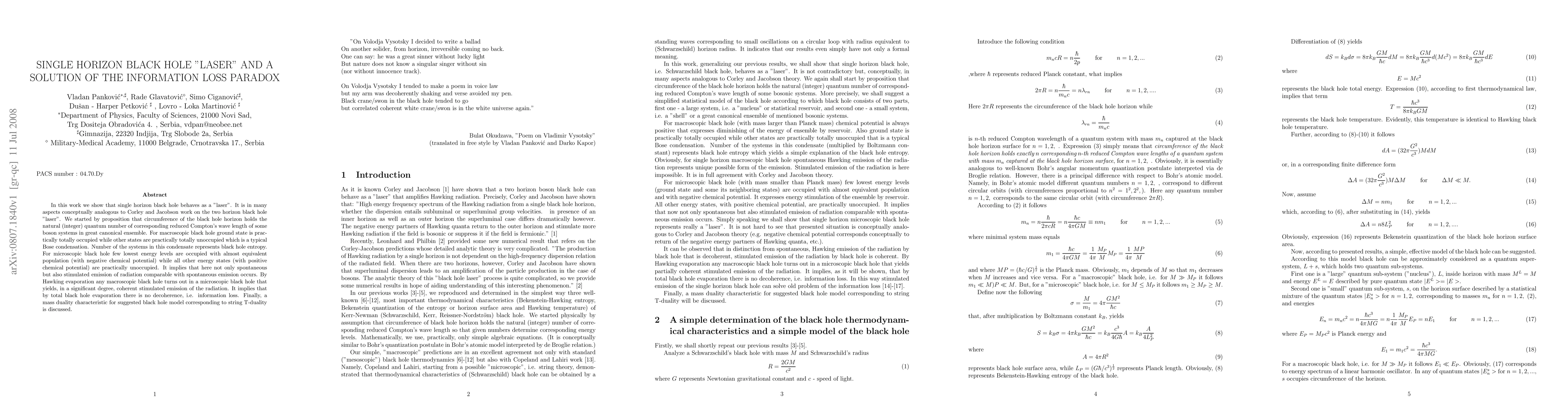 In this work we show that single horizon black hole behaves as a "laser". It is in many aspects conceptually analogous to Corley and Jacobson work on the two horizon black hole "laser". We started by proposition that circumference of the black hole horizon holds the natural (integer) quantum number of corresponding reduced Compton's wave length of some boson systems in great canonical ensemble. For macroscopic black hole ground state is practically totally occupied while other states are practically totally unoccupied which is a typical Bose condensation. Number of the systems in this condensate represents black hole entropy. For microscopic black hole few lowest energy levels are occupied with almost equivalent population (with negative chemical potential) while all other energy states (with positive chemical potential) are practically unoccupied. It implies that here not only spontaneous but also stimulated emission of radiation comparable with spontaneous emission occurs. By Hawking evaporation any macroscopic black hole turns out in a microscopic black hole that yields, in a significant degree, coherent stimulated emission of the radiation. It implies that by total black hole evaporation there is no decoherence, i.e. information loss. Finally, a mass duality characteristic for suggested black hole model corresponding to string T-duality is discussed.