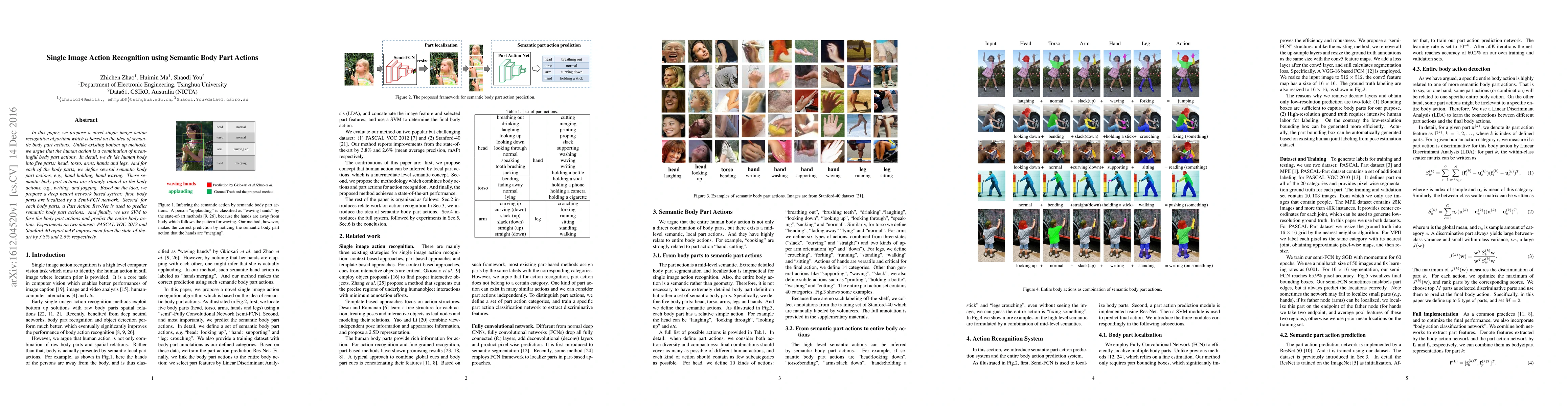 In this paper, we propose a novel single image action recognition algorithm which is based on the idea of semantic body part actions. Unlike existing bottom up methods, we argue that the human action is a combination of meaningful body part actions. In detail, we divide human body into five parts: head, torso, arms, hands and legs. And for each of the body parts, we define several semantic body part actions, e.g., hand holding, hand waving. These semantic body part actions are strongly related to the body actions, e.g., writing, and jogging. Based on the idea, we propose a deep neural network based system: first, body parts are localized by a Semi-FCN network. Second, for each body parts, a Part Action Res-Net is used to predict semantic body part actions. And finally, we use SVM to fuse the body part actions and predict the entire body action. Experiments on two dataset: PASCAL VOC 2012 and Stanford-40 report mAP improvement from the state-of-the-art by 3.8% and 2.6% respectively.