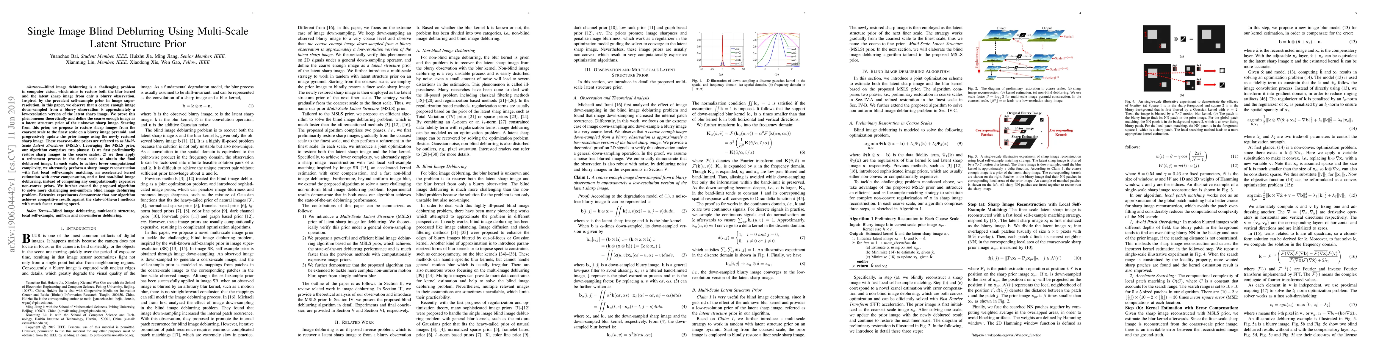 This paper proposes a method for single image blind deblurring using a Multi-Scale Latent Structure (MSLS) prior, which leverages coarse-to-fine image reconstruction on a blurry image pyramid. The method alternates between fast local self-example matching, accelerated kernel estimation, and non-blind deblurring to achieve a sharp final image efficiently.