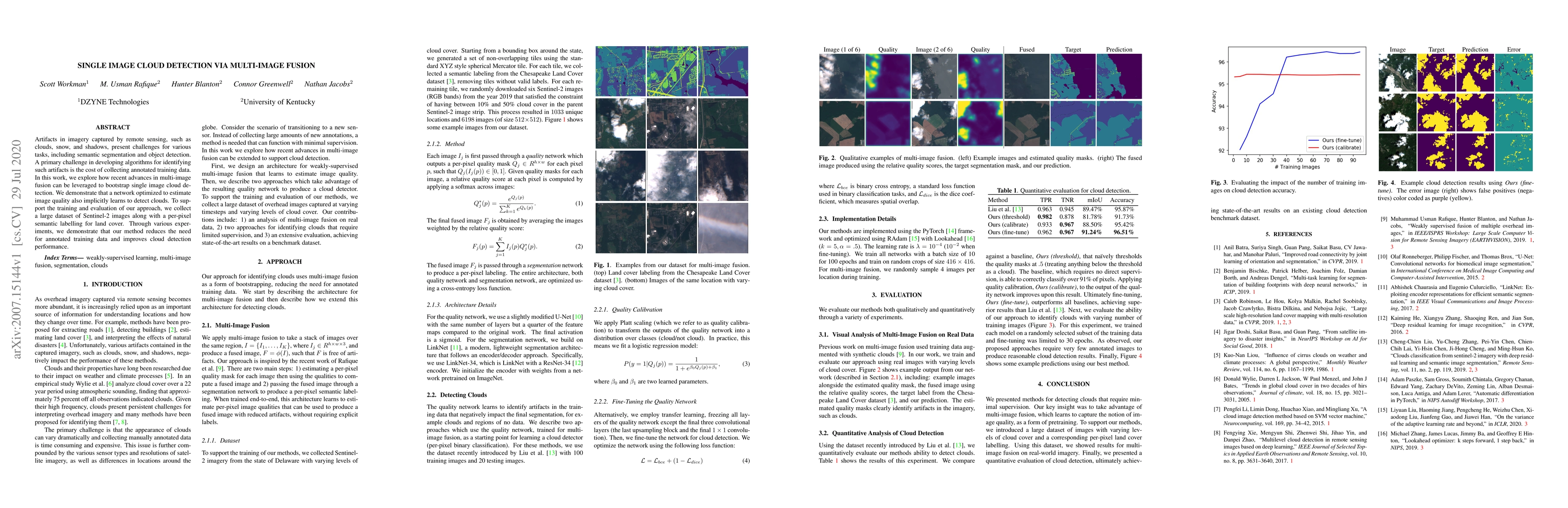 This paper proposes leveraging multi-image fusion techniques to enhance single image cloud detection in remote sensing imagery, reducing the need for extensive annotated training data. The authors collect a large Sentinel-2 dataset with per-pixel labels and show that a network trained to estimate image quality can implicitly detect clouds, improving detection performance.