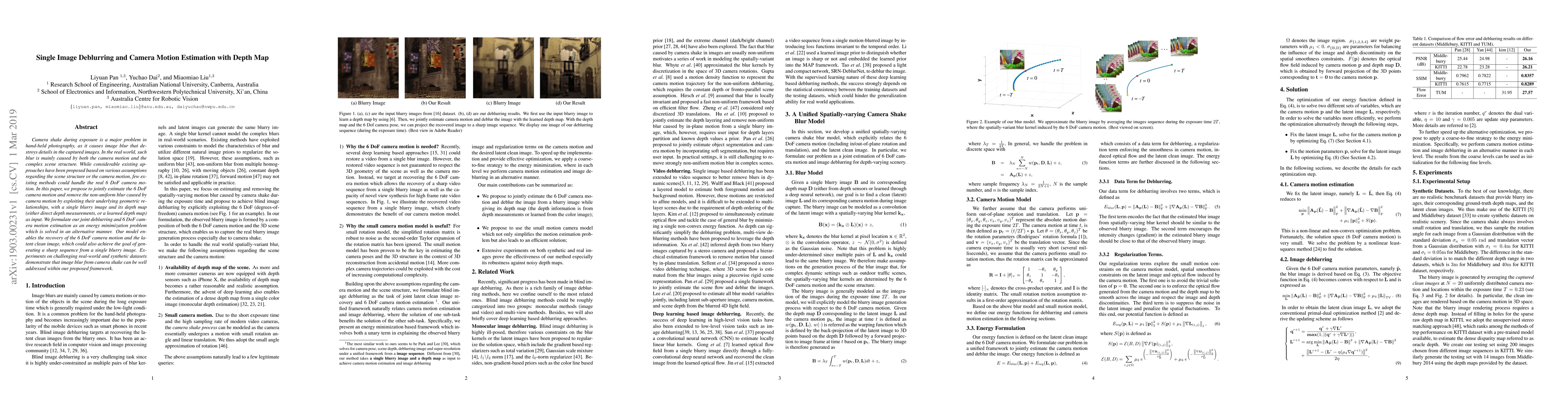 This paper proposes a method to jointly estimate 6 DoF camera motion and deblur a single image by leveraging depth map information, formulated as an energy minimization problem. Experiments show effective handling of camera shake-induced blur in real-world scenarios.