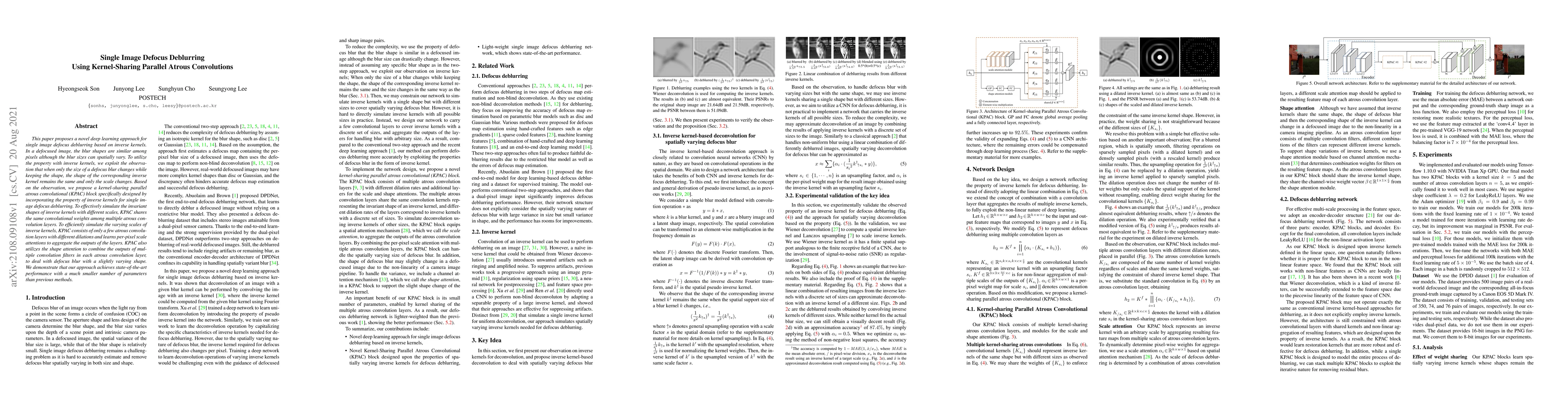 This paper introduces a deep learning method for single image defocus deblurring using kernel-sharing parallel atrous convolutions (KPAC) that leverages invariant inverse kernel shapes to efficiently simulate varying blur scales. The proposed KPAC block achieves state-of-the-art performance with fewer parameters compared to previous methods.