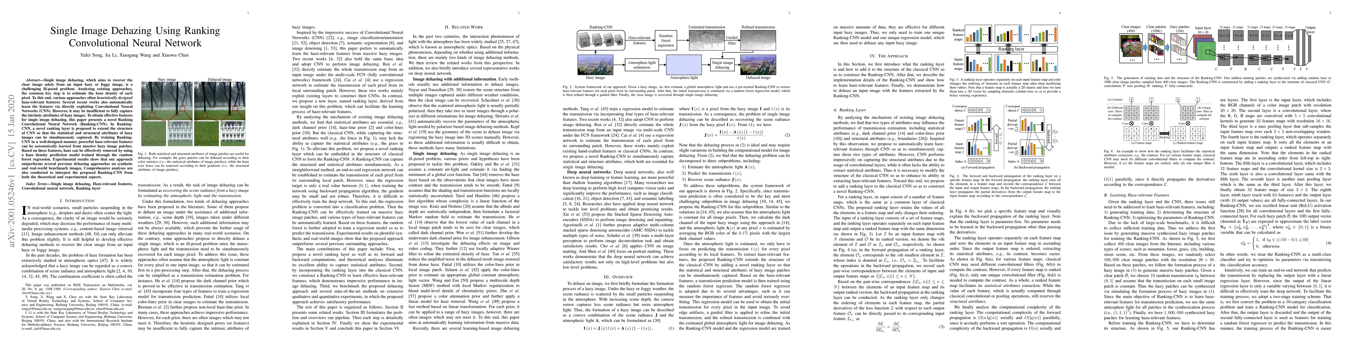 This paper introduces a Ranking Convolutional Neural Network (Ranking-CNN) to enhance single image dehazing by capturing both statistical and structural attributes of hazy images through a novel ranking layer. The method outperforms existing approaches by learning powerful haze-relevant features and effectively removing haze using a haze density prediction model.