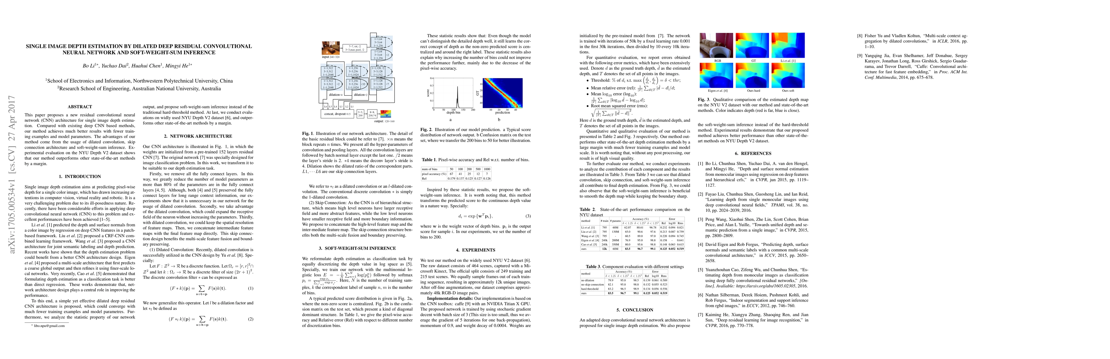 This paper introduces a dilated deep residual convolutional neural network for single image depth estimation, achieving superior results with fewer training examples and parameters through dilated convolutions, skip connections, and soft-weight-sum inference, outperforming other state-of-the-art methods on the NYU Depth V2 dataset.