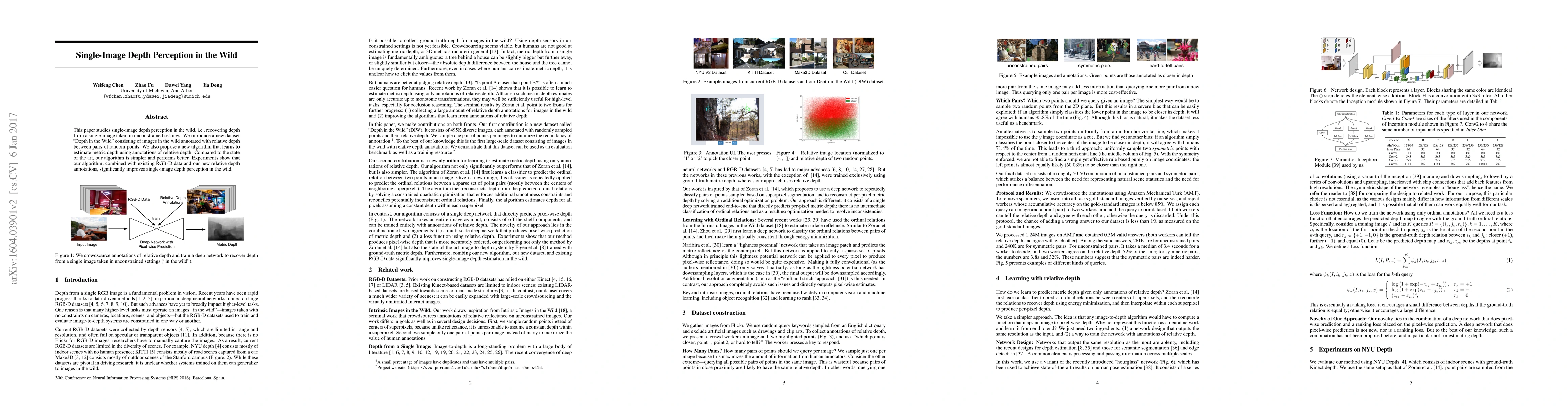 This paper introduces a new dataset "Depth in the Wild" for single-image depth perception and proposes a simpler algorithm that outperforms existing methods by using relative depth annotations. The algorithm, combined with RGB-D data, significantly enhances single-image depth estimation in unconstrained settings.